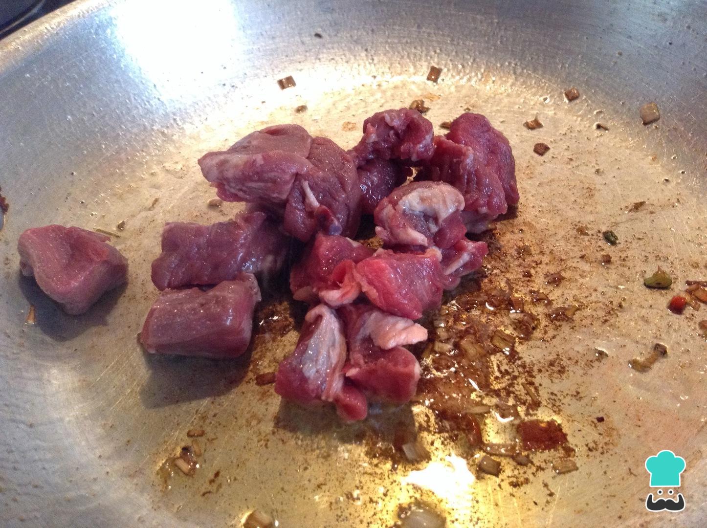 Leve ao fogo outra panela com um pouco de óleo e, quando estiver quente, sele a carne bovina cortada em pedaços e temperada com sal e pimenta.