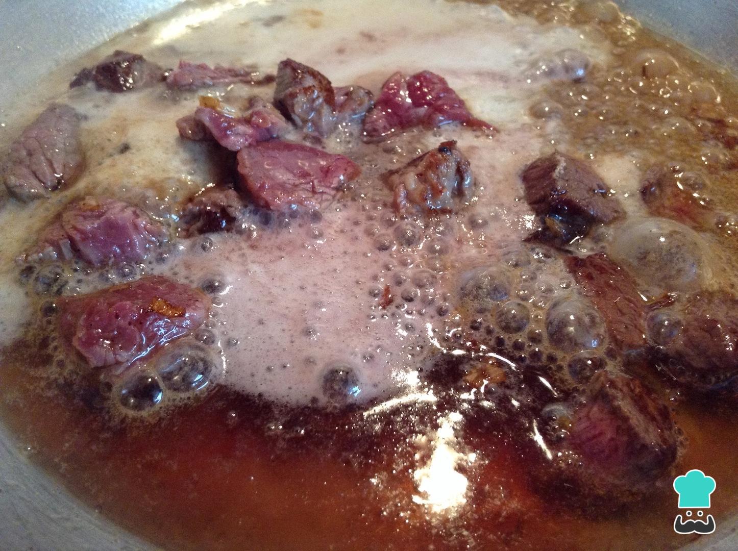 Assim que a carne estiver selada, acrescente a cerveja, que irá conferir um sabor diferente e muito agradável a este guisado de carne com batatas.