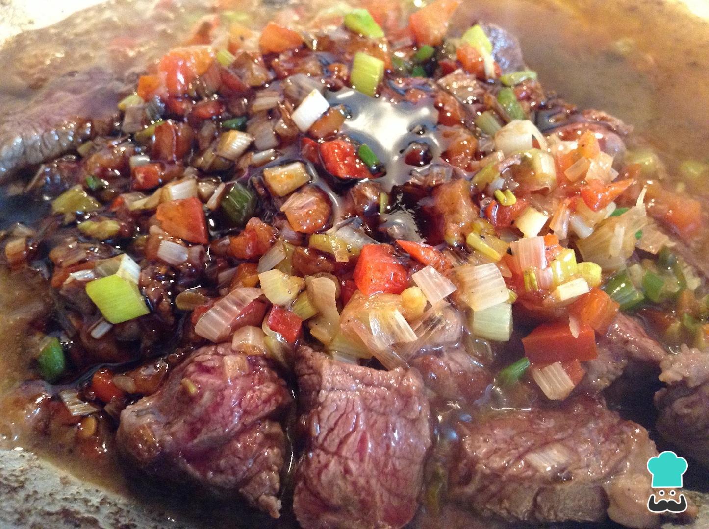 Adicione também o molho escuro e o vinho tinto. Baixe o fogo para cozinhar o guisado lentamente e permitir a libertação gradual de sabores.