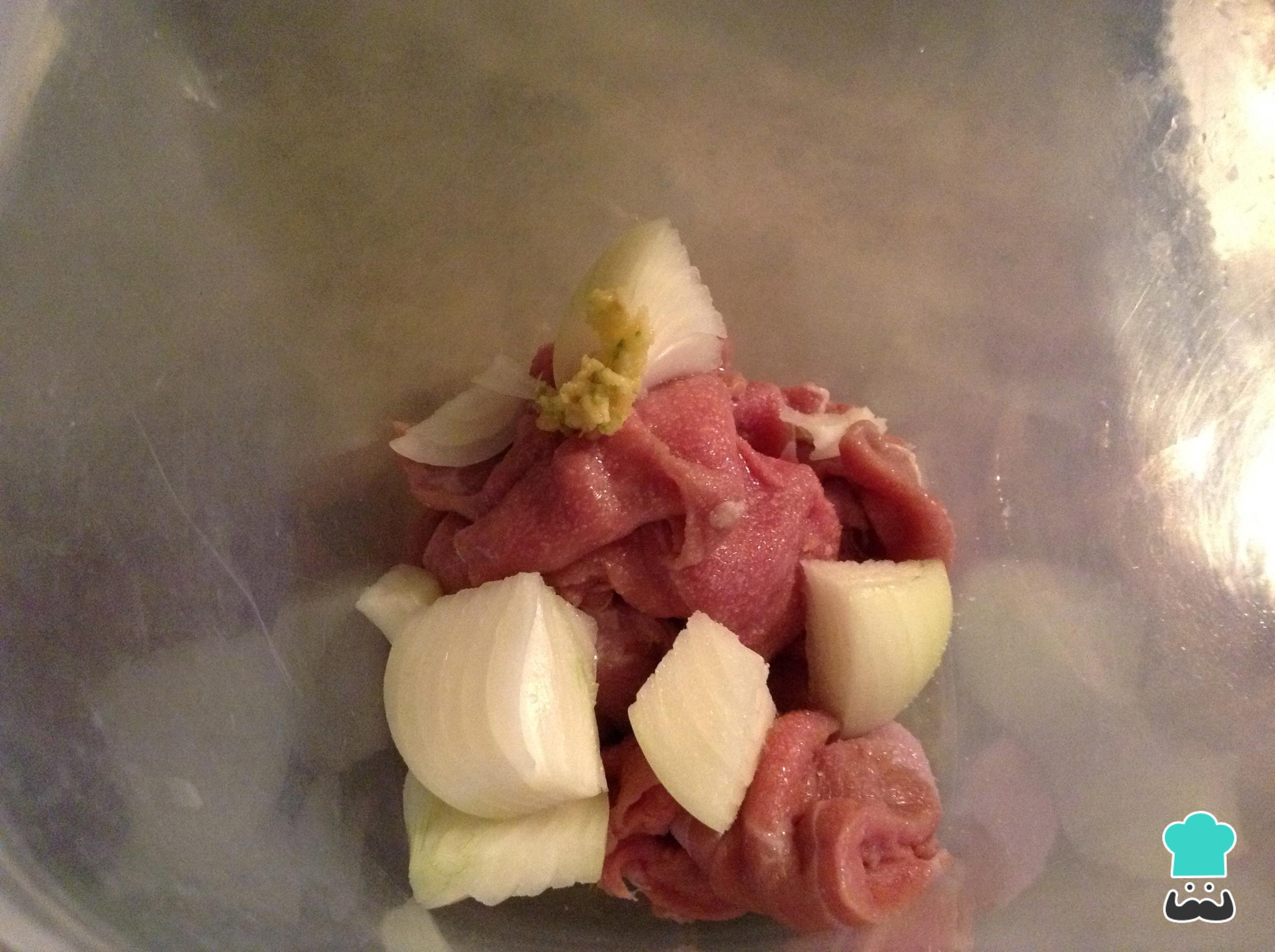 No copo do liquidificador ou em um copo alto (caso use o mixer), coloque a carne e a cebola, ambas cortadas em pedaços, a pasta de alho, sal e pimenta. Bata bem estes ingredientes.