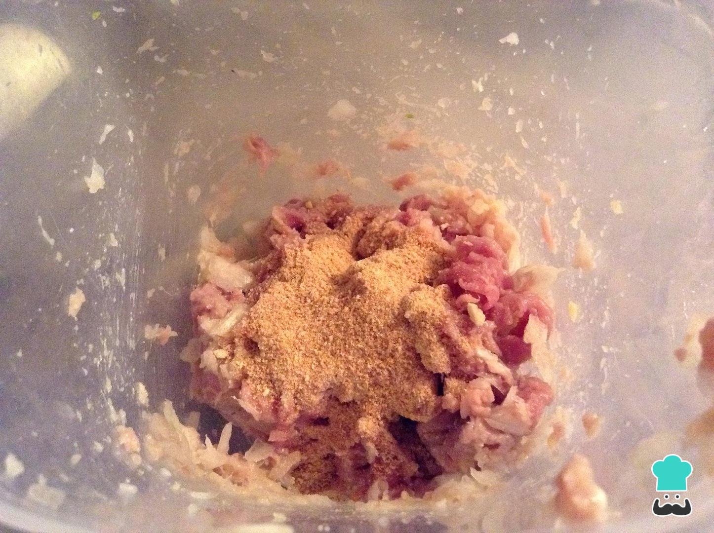 O passo seguinte deste hambúrguer americano caseiro é acrescentar a farinha de rosca e misturar muito bem. Se o preparado estiver seco, poderá ser necessário acrescentar um ovo.