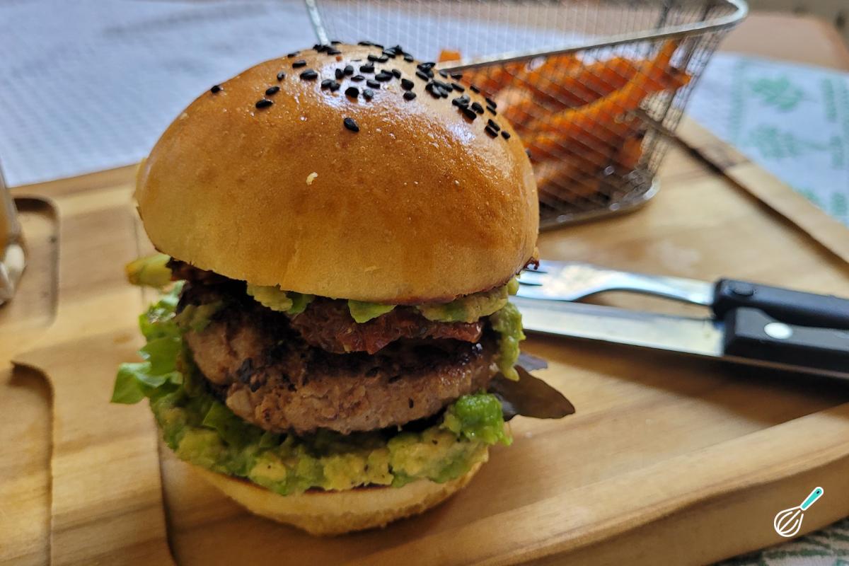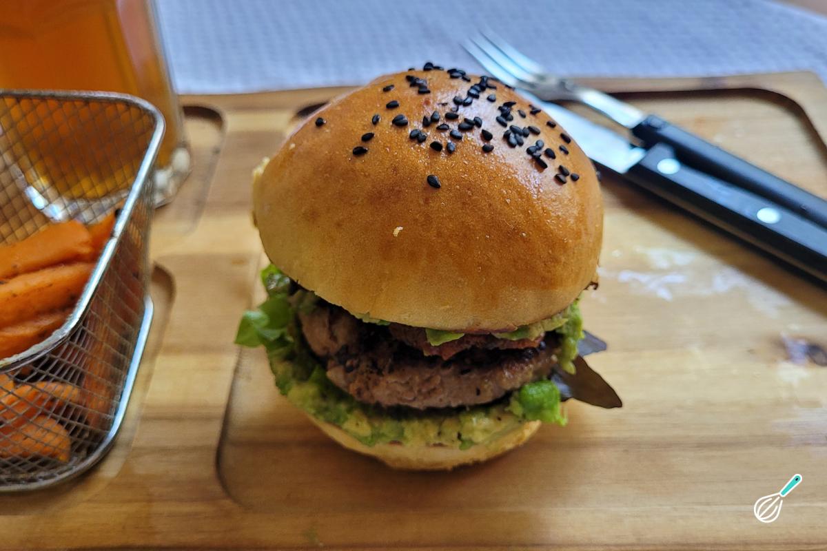 Seu hambúrguer artesanal está pronto. Aqui servi com batata doce laranja em palitos na air fryer e chá gelado.