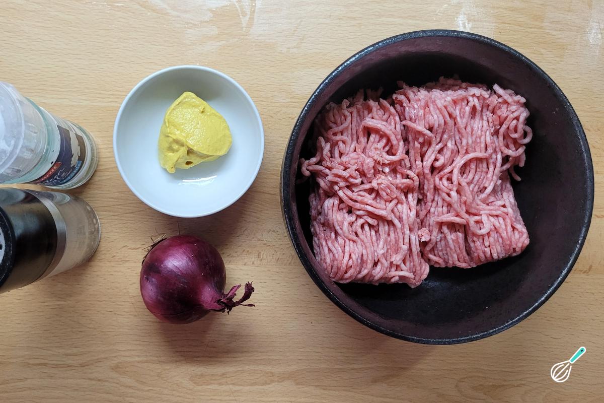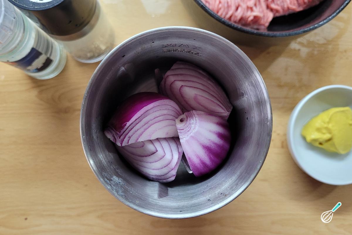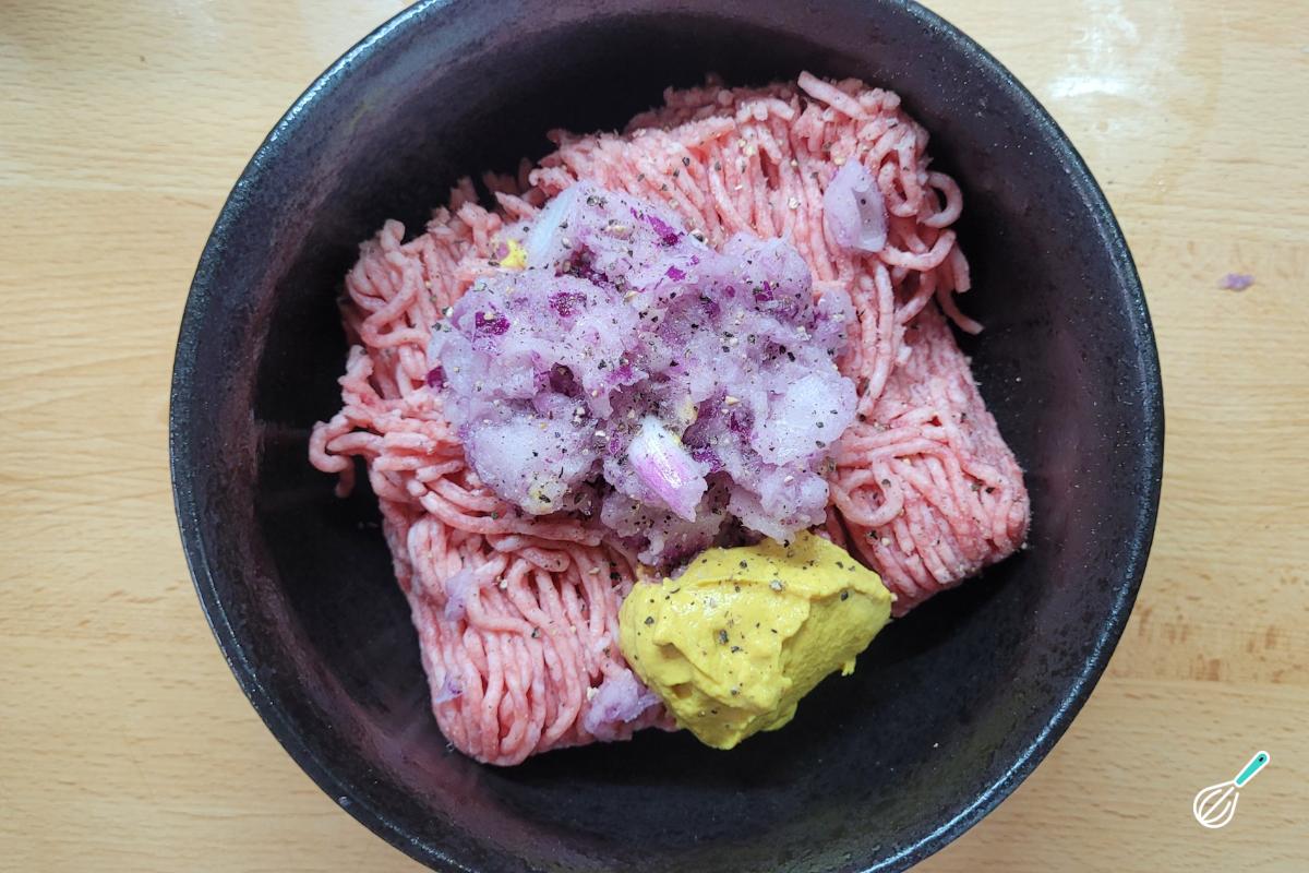 Vamos começar preparando a carne. Para um hambúrguer suculento e saboroso, gosto de adicionar cebola ralada e mostarda à carne e uso apenas sal e pimenta do reino como temperos. Usei a cebola roxa, mas pode ser qualquer uma.
