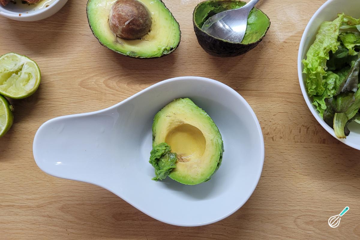 Enquanto o hambúrguer grelha, vamos preparar o molho, que aqui é à base de avocado. Você pode usar avocado ou abacate, mas o avocado é um pouco mais cremoso. Basta cortar o avocado ao meio e colocar uma das metades em uma tigela.