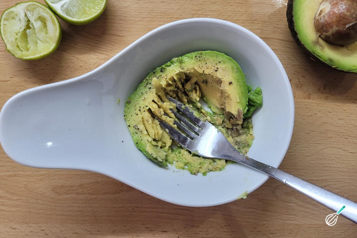 Tempere com sal, pimenta do reino e limão e amasse bem com um garfo. O limão, além de dar sabor, também evita que o avocado escureça. Por isso, se estiver usando apenas uma das metades e for guardar o restante, pingue algumas gotinhas de limão na parte que será guardada também e guarde em um pote bem fechado ou embrulhe em plástico filme para que não escureça.