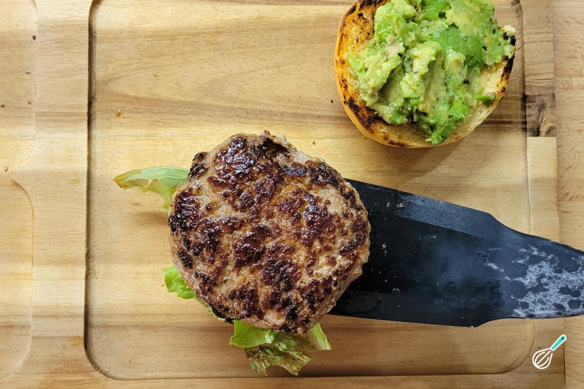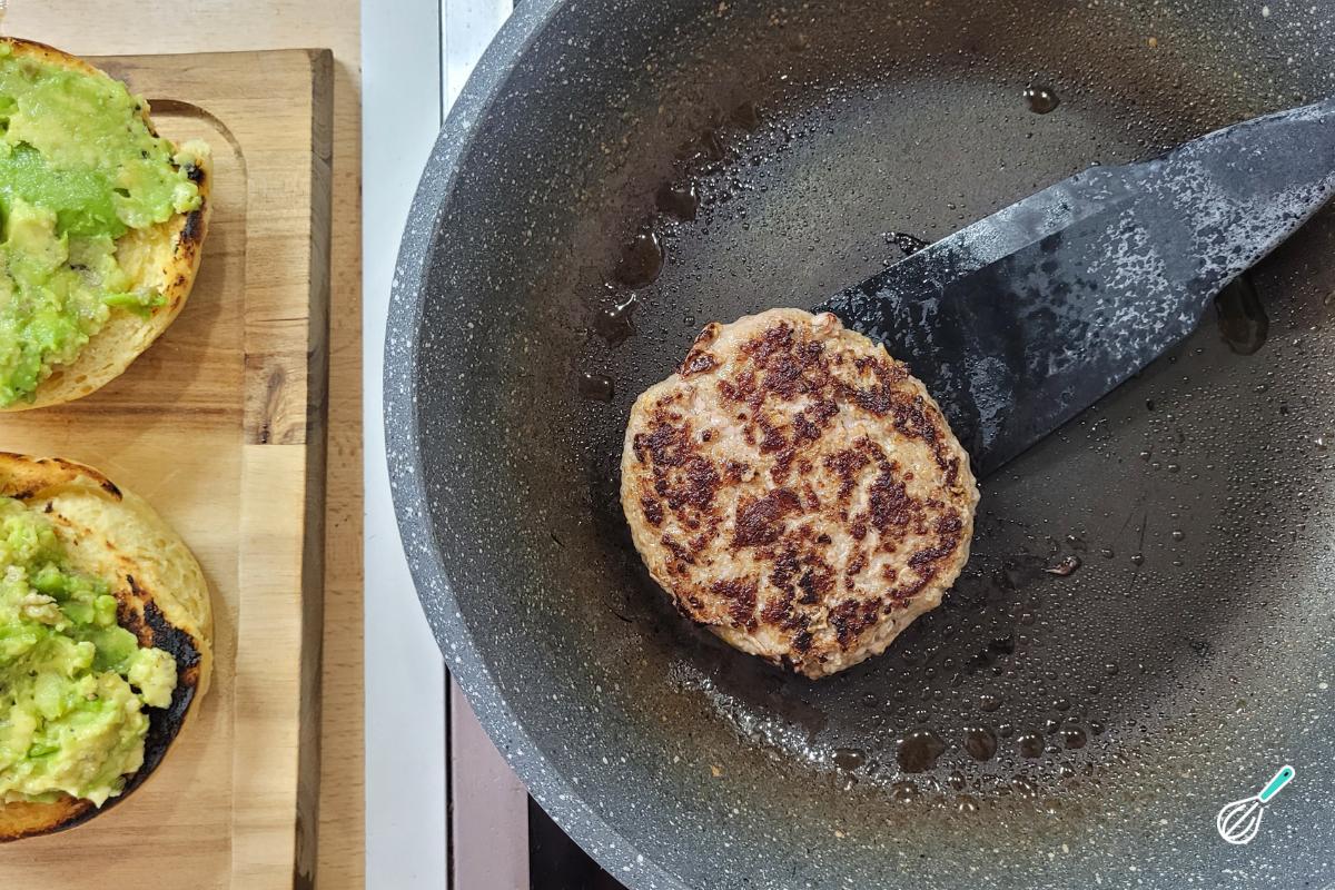 Espalhe o abacate amassado nas duas fatias de pão. Quando o hambúrguer estiver bem dourado de um lado, vire e deixe dourar do outro lado. Depois abaixe um pouco o fogo para que termine de cozinhar por dentro até chegar no ponto que quiser.