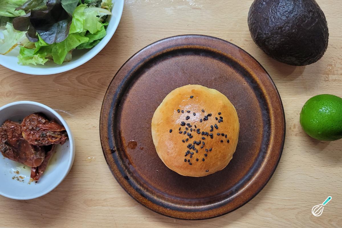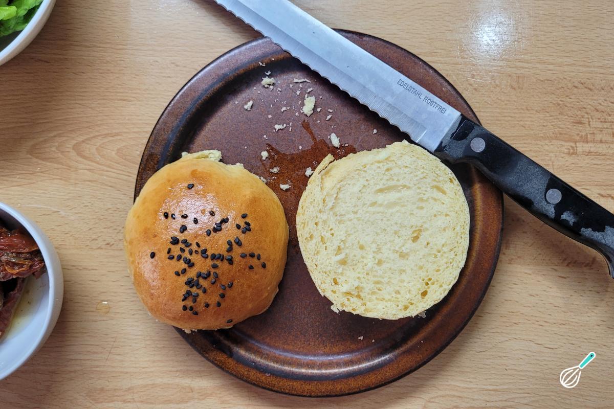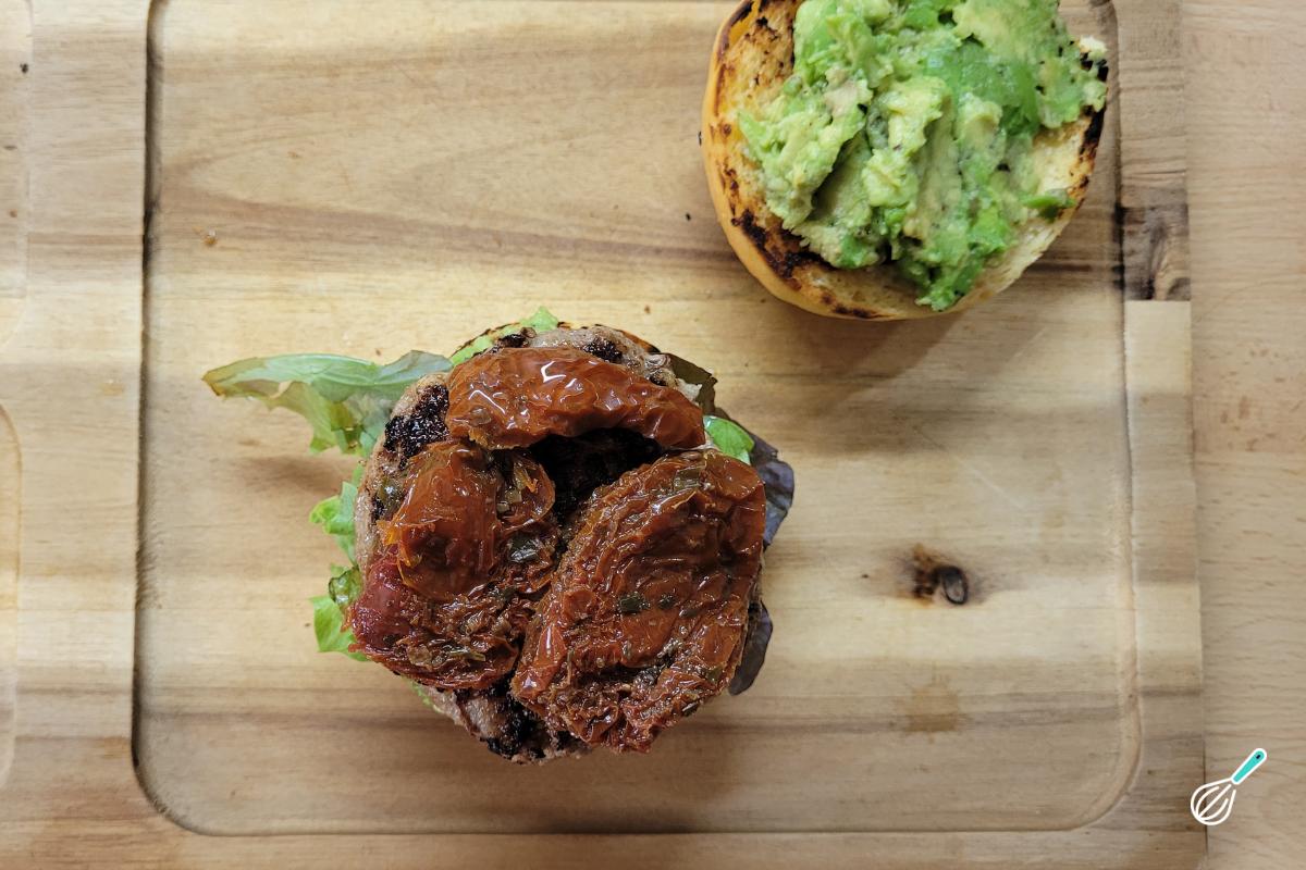 Coloque o tomate seco por cima e cubra com a outra metade do pão.