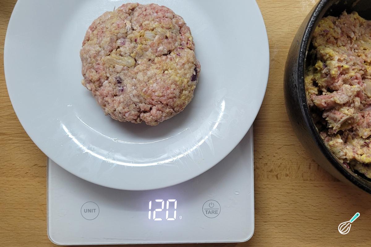 Pegue porções da mistura e forme os hambúrgueres - o tamanho depende do que você quiser e do tamanho do seu pão. Aqui fiz 3 hambúrgueres de cerca de 120g. Lembre-se que os hambúrgueres vão diminuir ao grelhar.