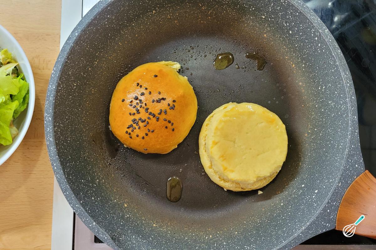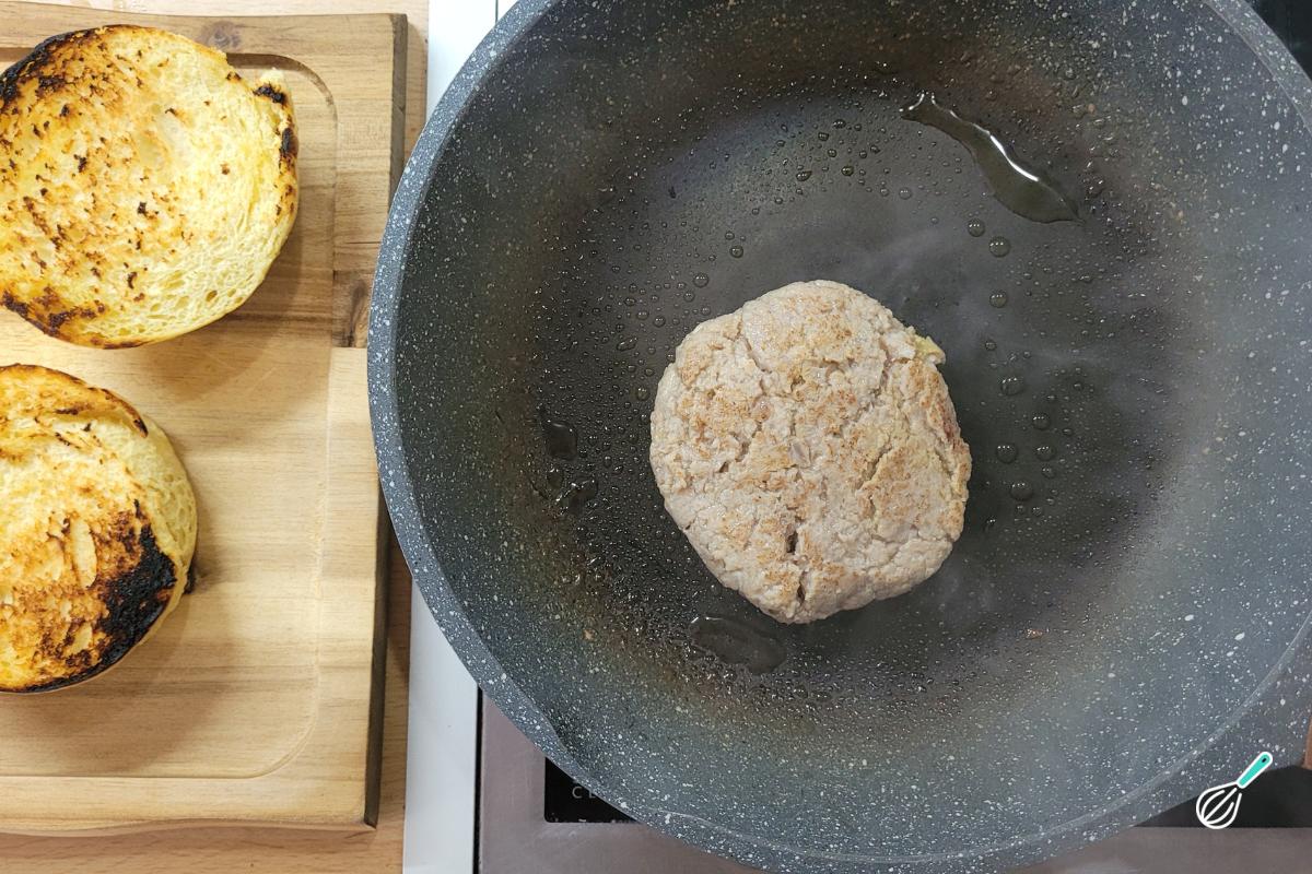 Reserve os pães. Na mesma frigideira, coloque mais um fio de azeite (ou um pouco de manteiga, se preferir) e o hambúrguer. Também é possível fazer esse hambúrguer na air fryer, se preferir.