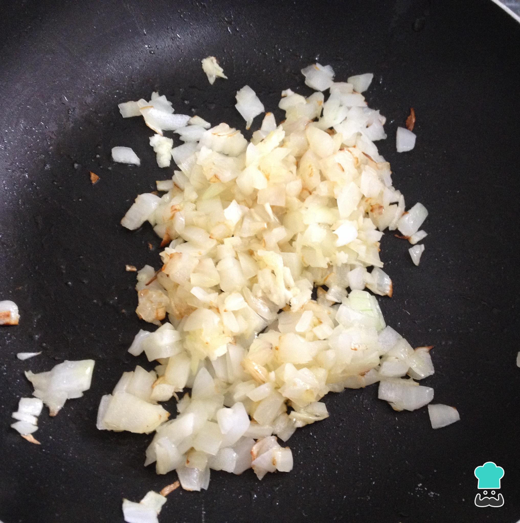 Em uma frigideira quente com azeite, refogue a cebola e o alho picados com um pouco de sal, por 3 minutos.