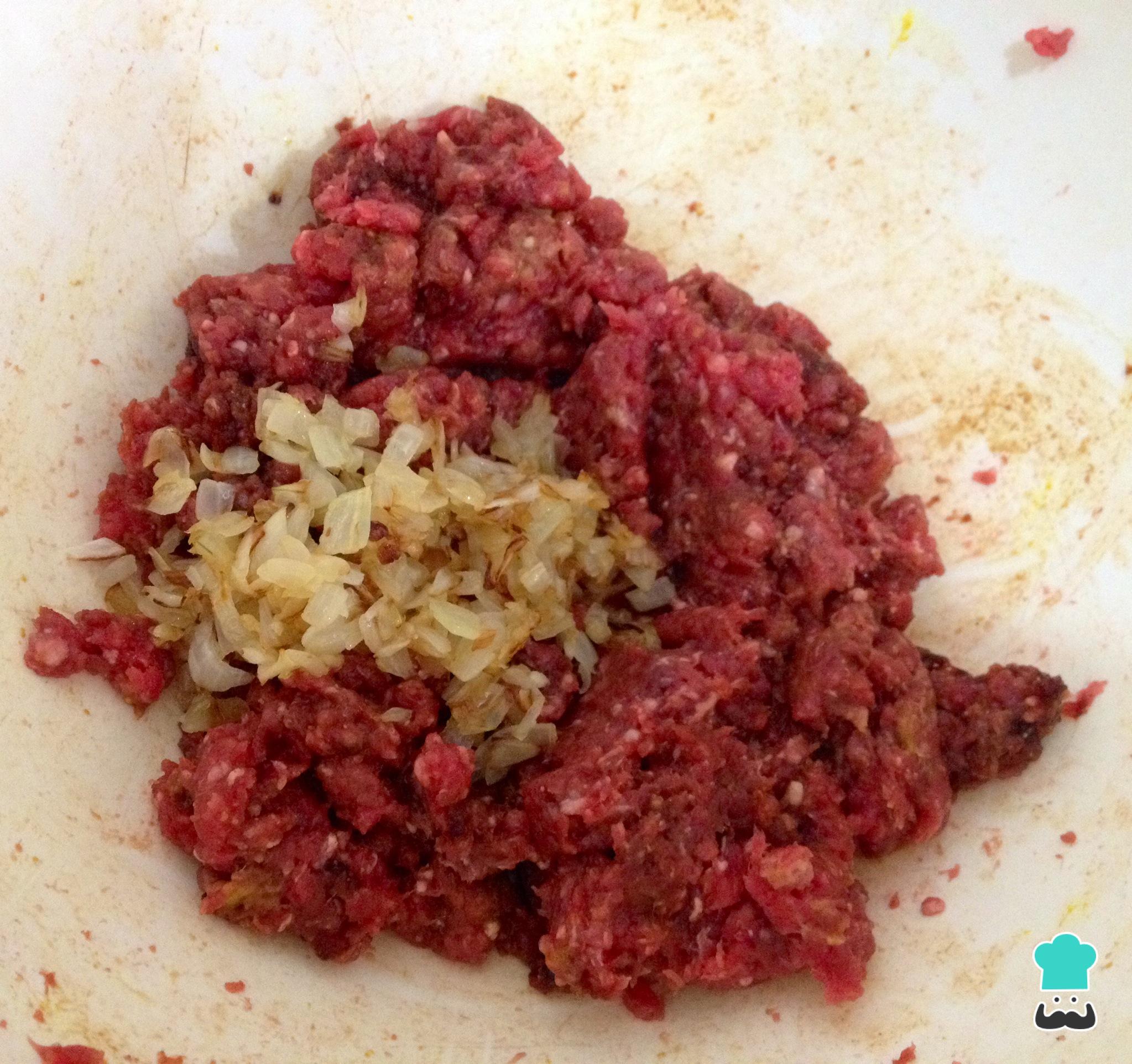 Quando a cebola estiver frita, junte-a à carne e misture. A cebola frita irá conferir um gostinho adocicado a este hambúrguer caseiro.