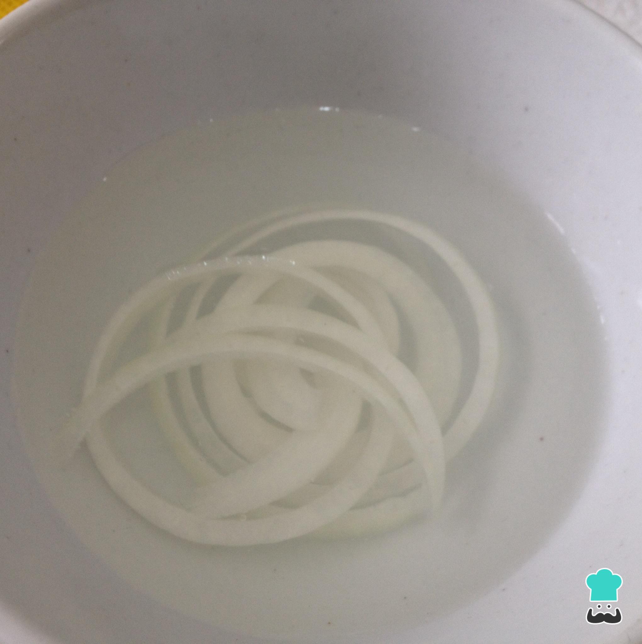 Enquanto isso, prepare os ingredientes que acompanham este hambúrguer caseiro: corte a cebola em rodelas e mergulhe-a em uma tigela com água e sal, para diminuir o gosto amargo. Descasque o abacate e corte em rodelas finas.