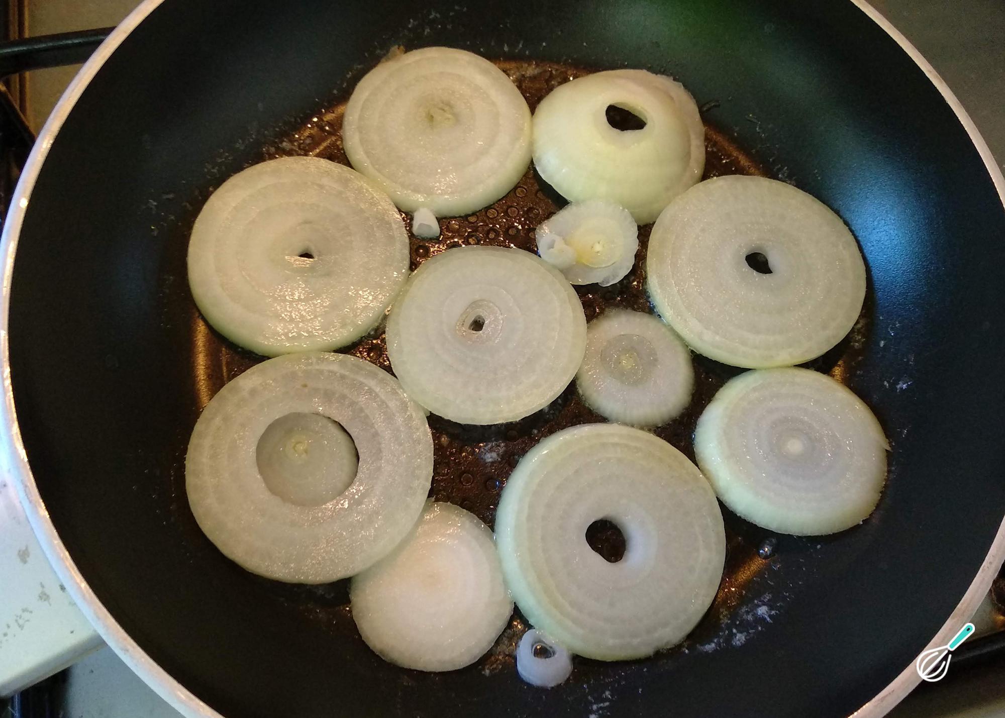 Numa frigideira derreta a manteiga e coloque as cebolas cortadas em rodelas, tentando não sobrepôr. Deixe no fogo médio para baixo até ficarem transparentes - cerca de 5 minutos.