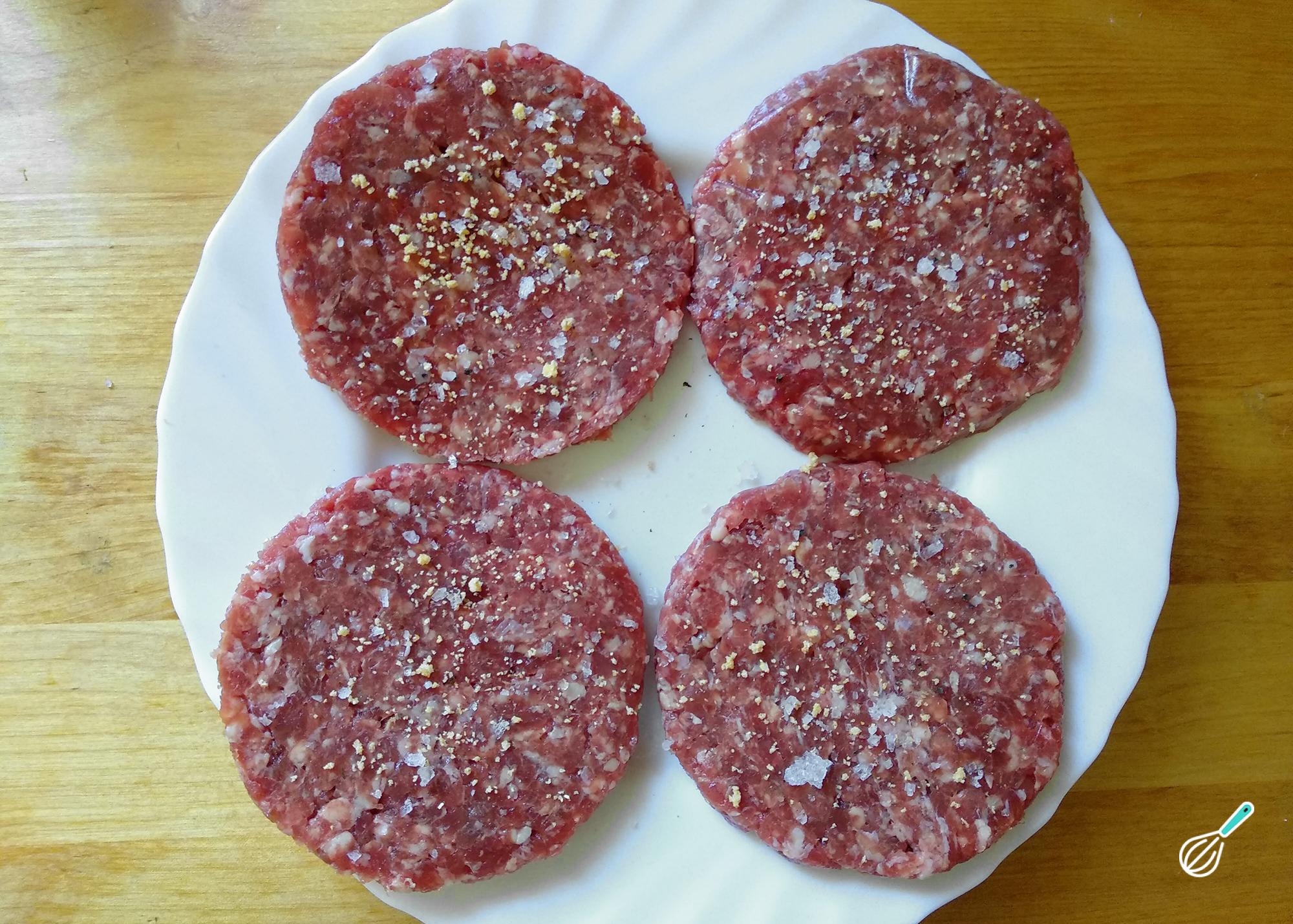 Enquanto isso tempere os hambúrgueres com sal, pimenta e alho.