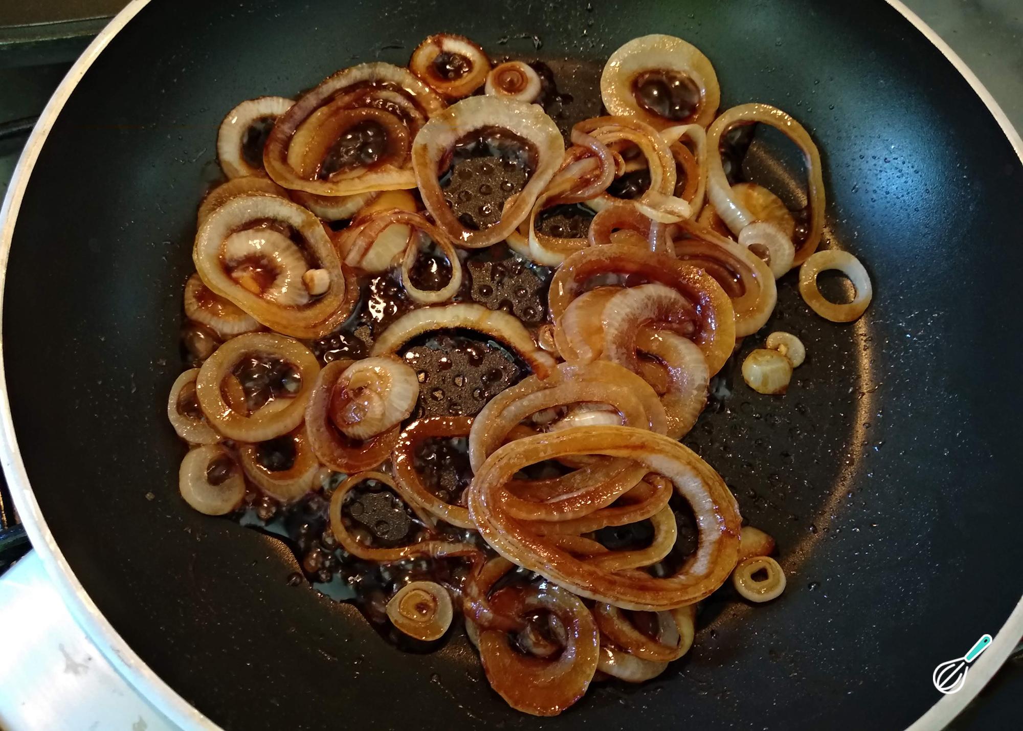 Quando as cebolas ficarem transparentes, acrescente o shoyu e o açúcar e misture para envolver nos ingredientes e separar os aros das rodelas. Deixe cozinhar por mais 5 minutos ou até a cebola ficar macia e caramelizada.