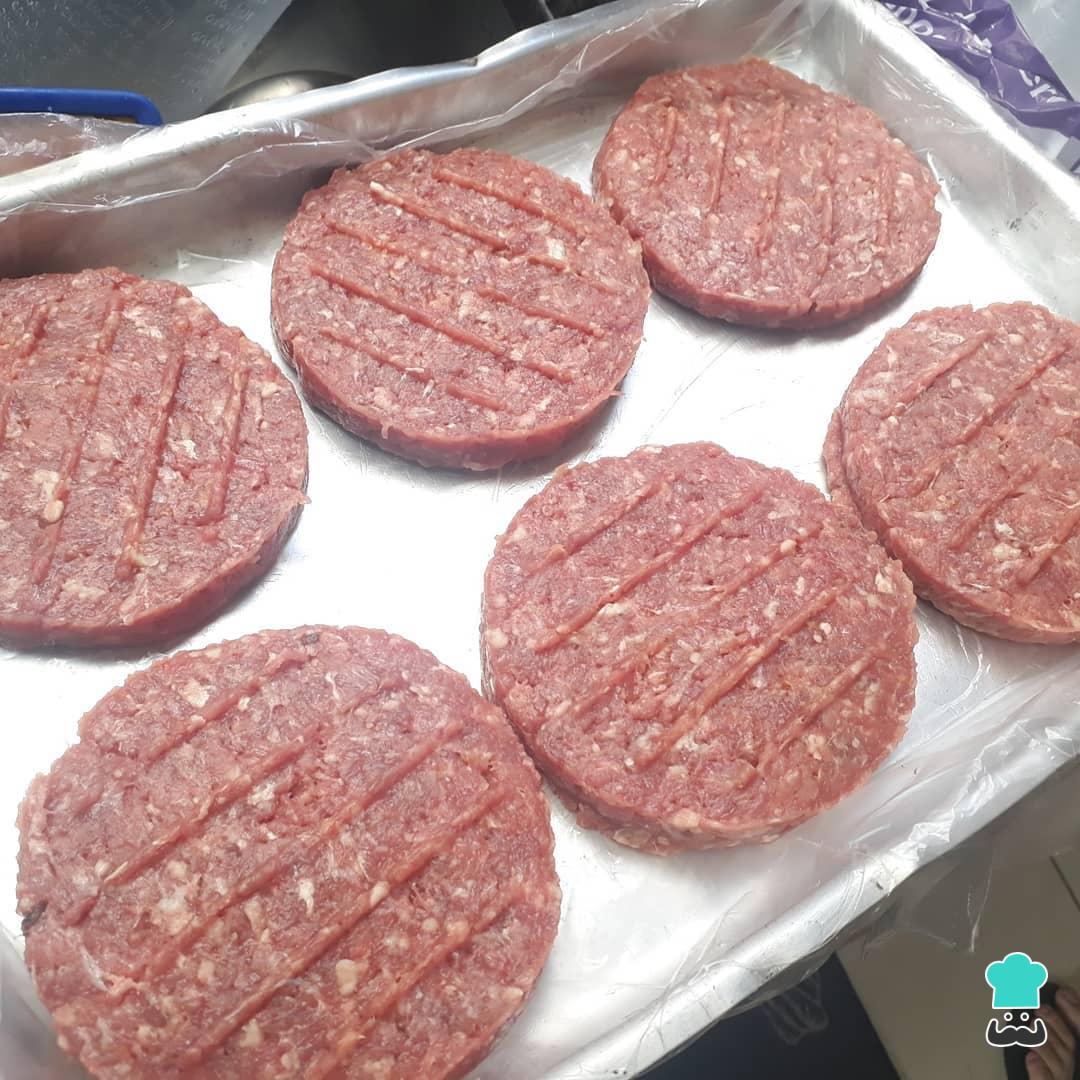 Essa receita de hambúrguer rende 1 kg de carne para hambúrguer. Para congelar hambúrguer que você não vai cozinhar na hora, cubra uma assadeira com um saco plástico ou com plástico filme, ajeite os hambúrgueres nela e leve para o congelador. Assim que estiverem bem firmes, retire-os da forma e junte em um saco plástico - pode ser todos juntos, uma vez que, depois de congelados, não grudam mais uns nos outros.