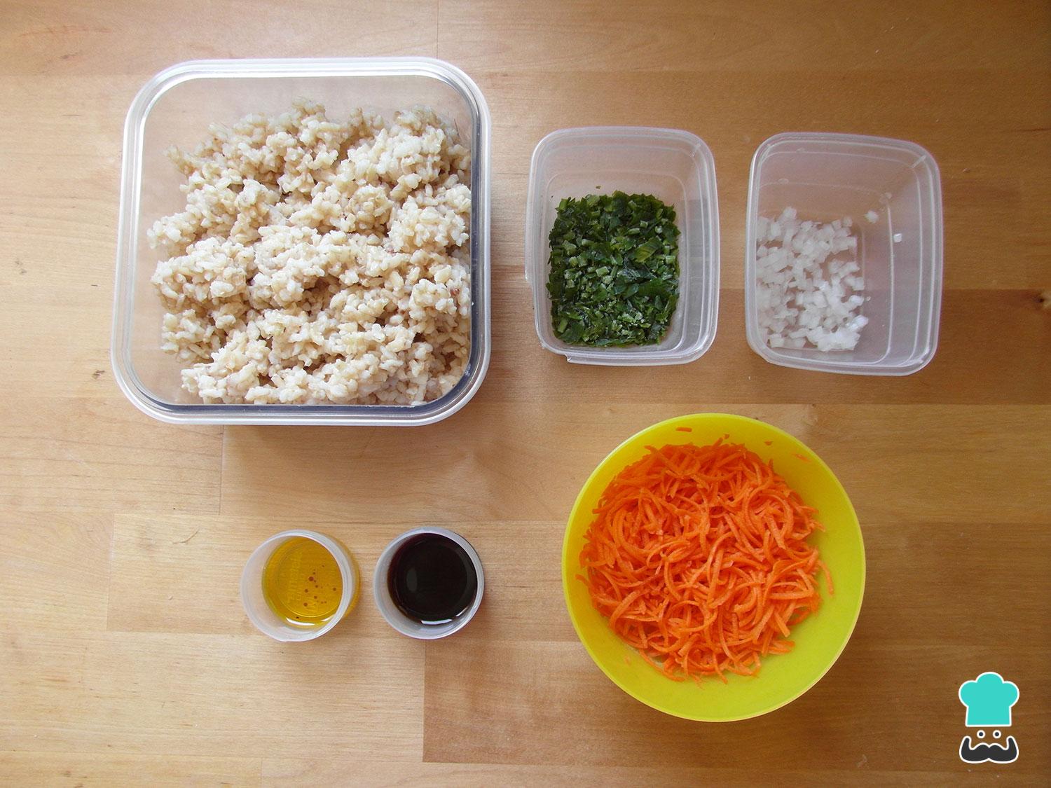 Para fazer essa receita com arroz integral comece por reunir os ingredientes necessários. Se o arroz tiver sido cozinhado com cebola, como foi o meu caso, reduza a quantidade de cebola desta receita. Também pode adicionar outros temperos a seu gosto, como curry e gengibre.