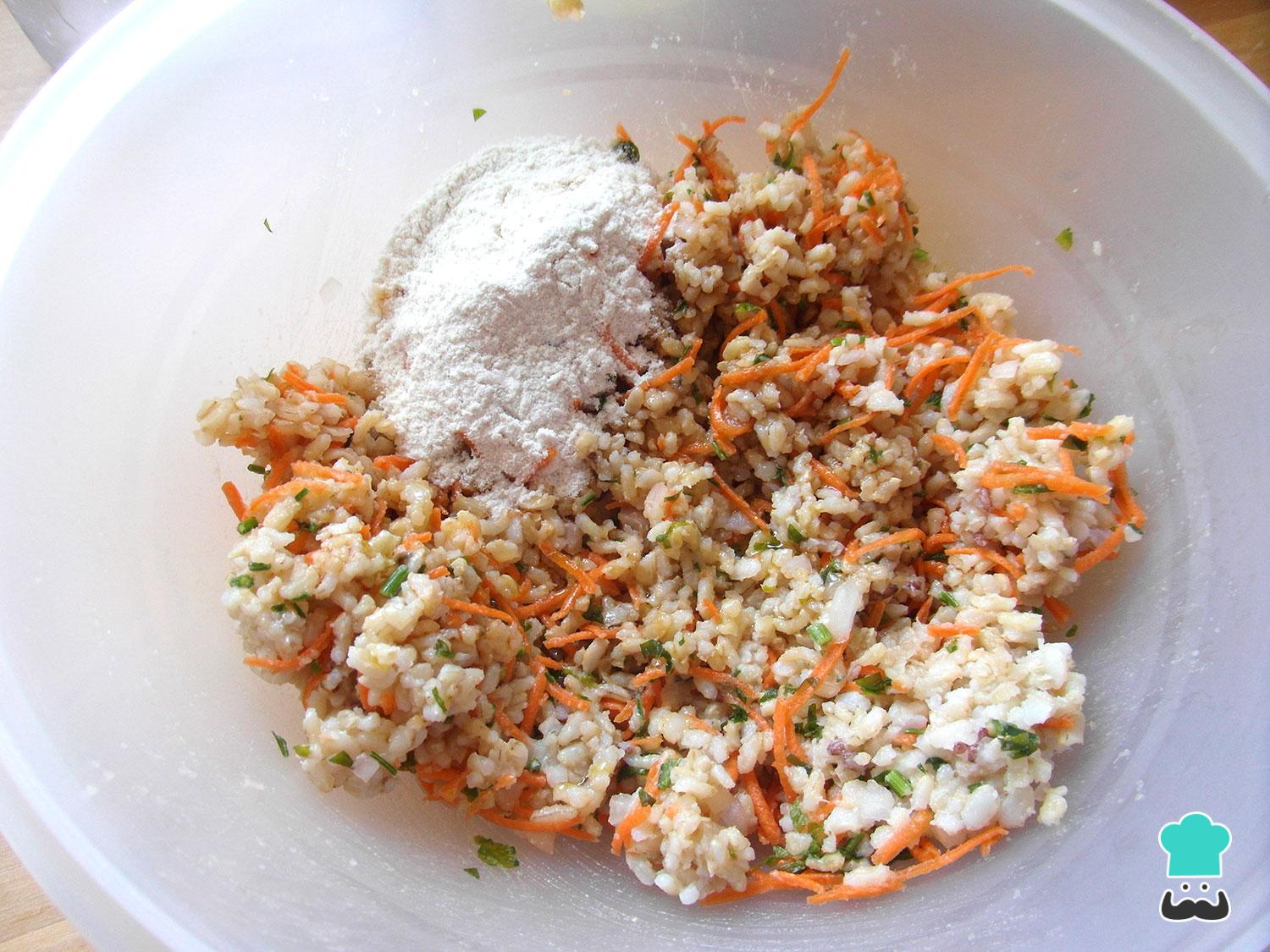 Coloque todos os ingredientes em uma tigela e misture com as mãos. Se, depois de misturar bem, a consistência estiver mole demais para formar hambúrgueres, acrescente um pouco de farinha de rosca ou, para uma versão sem glúten, farinha de arroz. Retifique o sal e a pimenta.