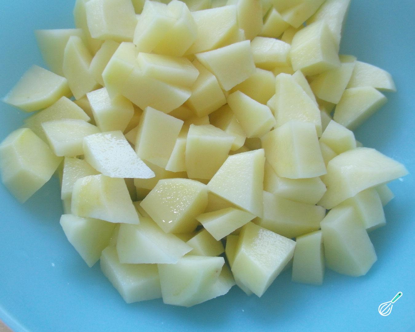 Descasque as batatas e corte em pedaços pequenos, para que cozinhem mais depressa.