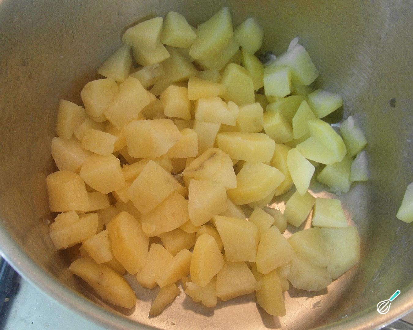 Coloque as batatas numa panela, cubra com água e adicione um pouco de sal. Deixe ferver por uns 10 minutos ou até ficarem bem macias. Escorra a água e amasse as batatas até obter um purê que não precisa ser muito lisinho.