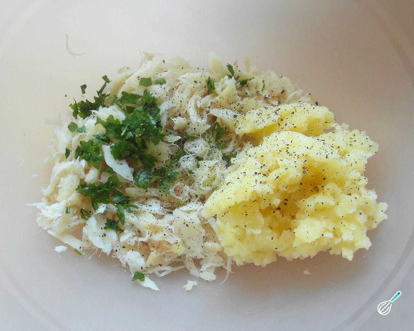 Coloque o bacalhau desfiado numa tigela e adicione os demais ingredientes: as batatas amassadas, a salsinha picada e pimenta a gosto. Misture muito bem com as mãos até obter uma mistura compacta.