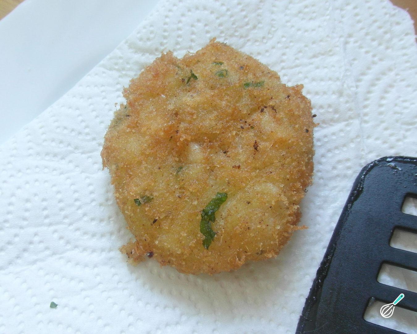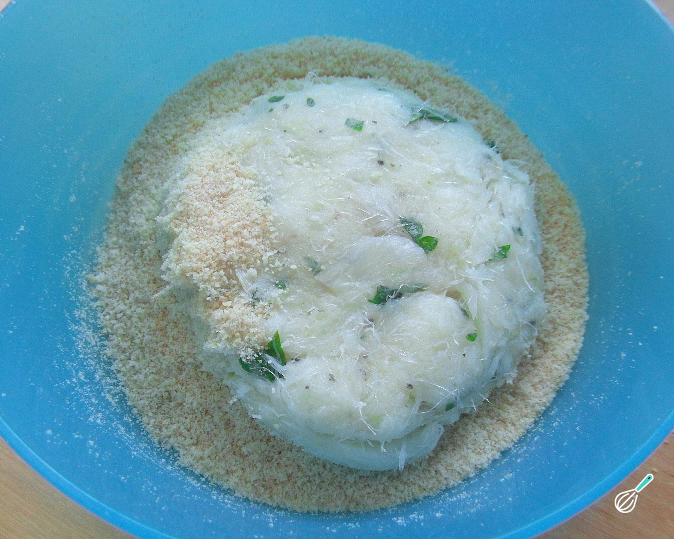 Separe 3-4 porções desta massa e modele em forma hambúrgueres. Envolva em farinha de rosca, para conseguir uma crosta crocante que também ajuda a manter o formato do hambúrguer.