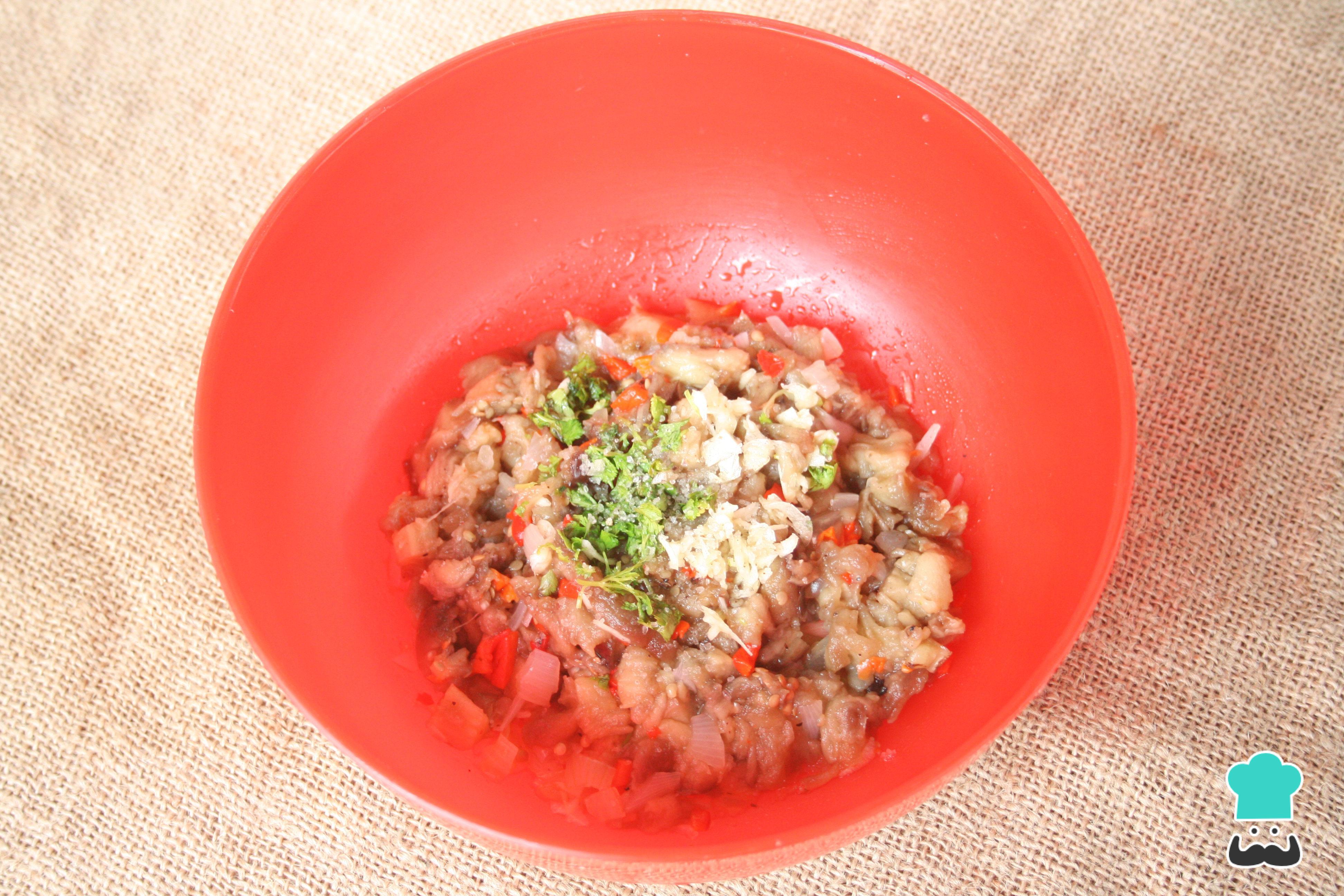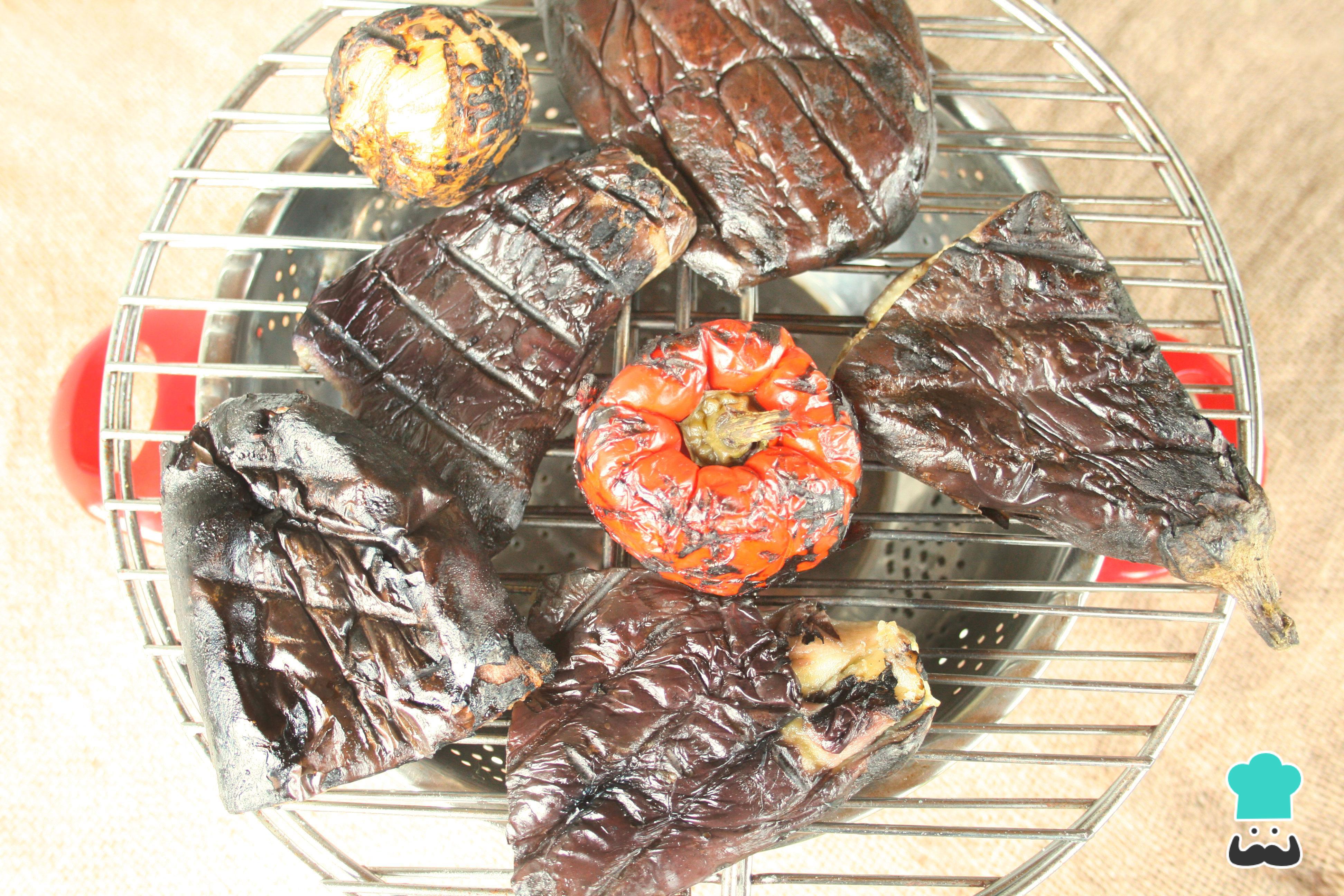 Retire e coloque os legumes sobre papel absorvente, para que escorram seus sucos enquanto esfriam. Por fim retire a pele queimada dos legumes e pique em cubinhos pequenos, como na foto. Pique também os alhos e a salsinha.