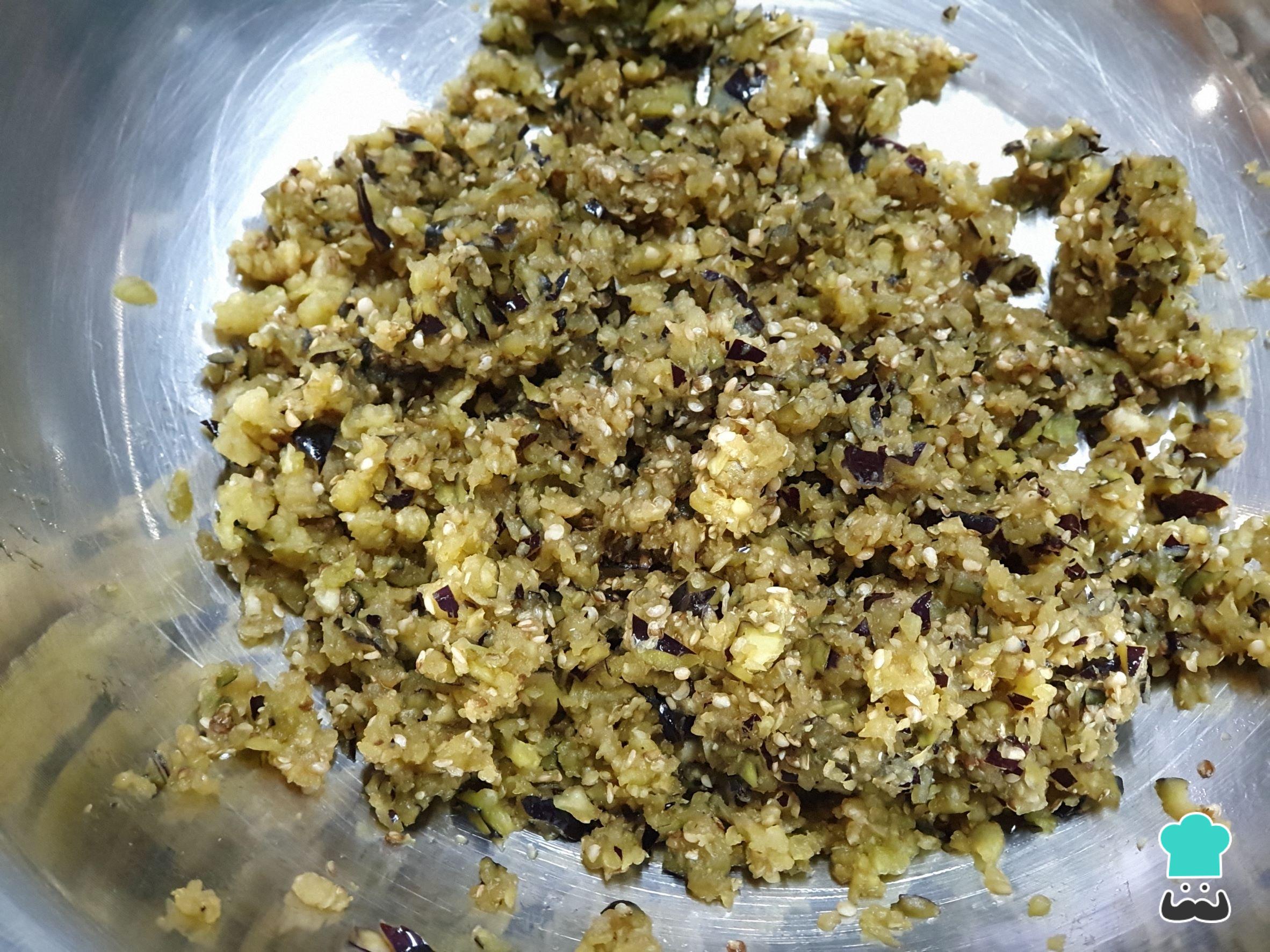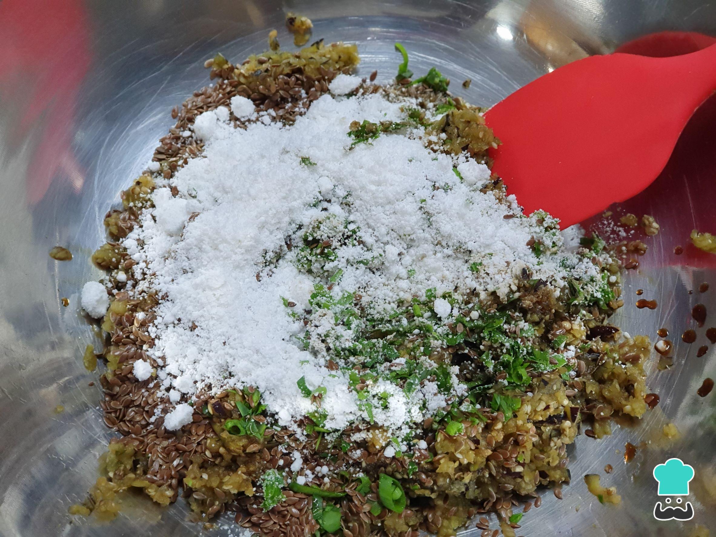 Dependendo do tamanho da sua berinjela e da quantidade de líquido que ela poderá soltar, a sua massa pode exigir um pouco mais de tapioca e farelo de aveia. No entanto, se precisar adicionar mais tapioca ou farelo, não deixe que a massa fique muito seca, pois ela precisa estar úmida.