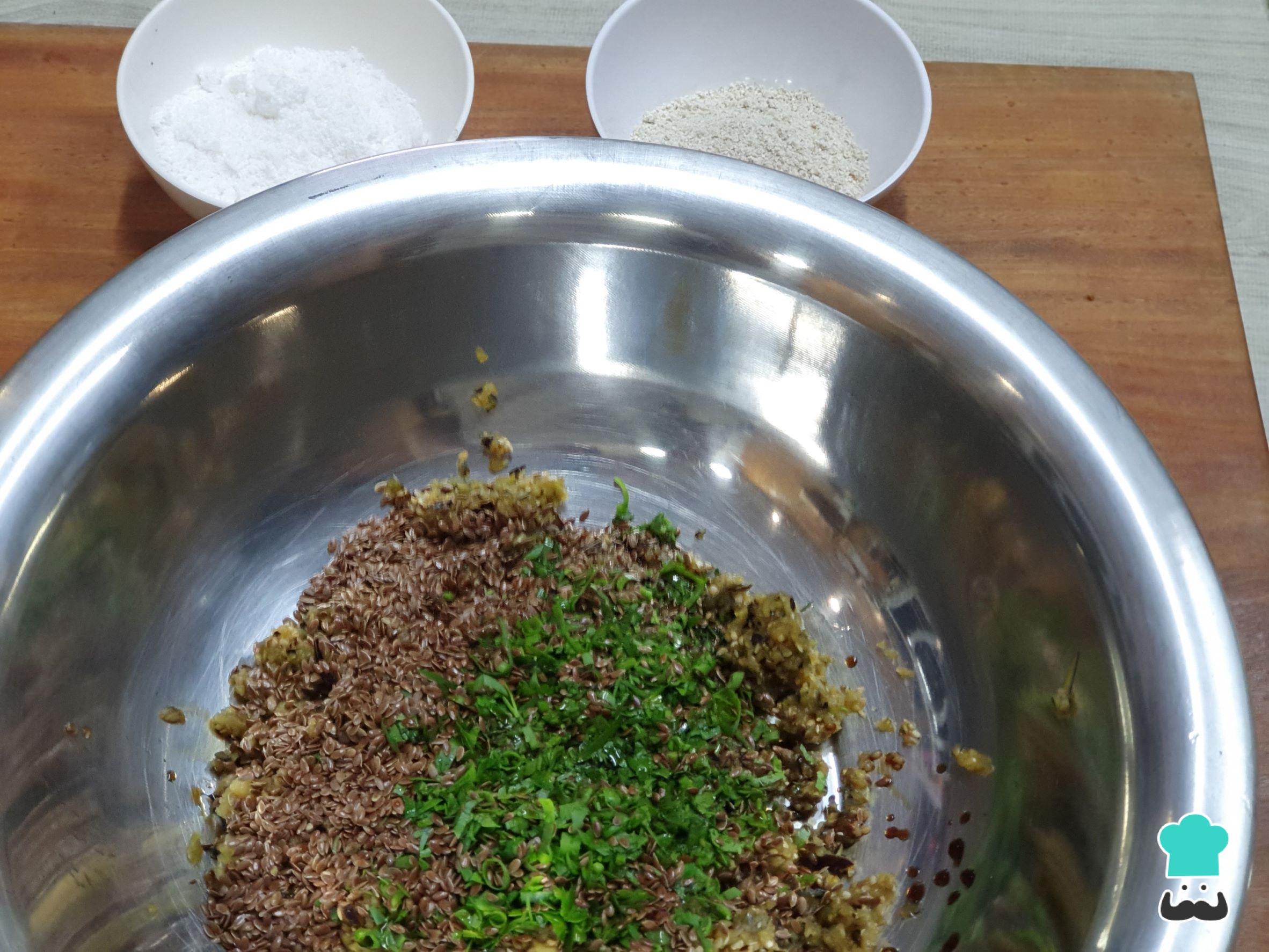 Coloque a berinjela e linhaça em uma tigela. Adicione o molho de soja, o tempero verde picado e o sal e misture muito bem.