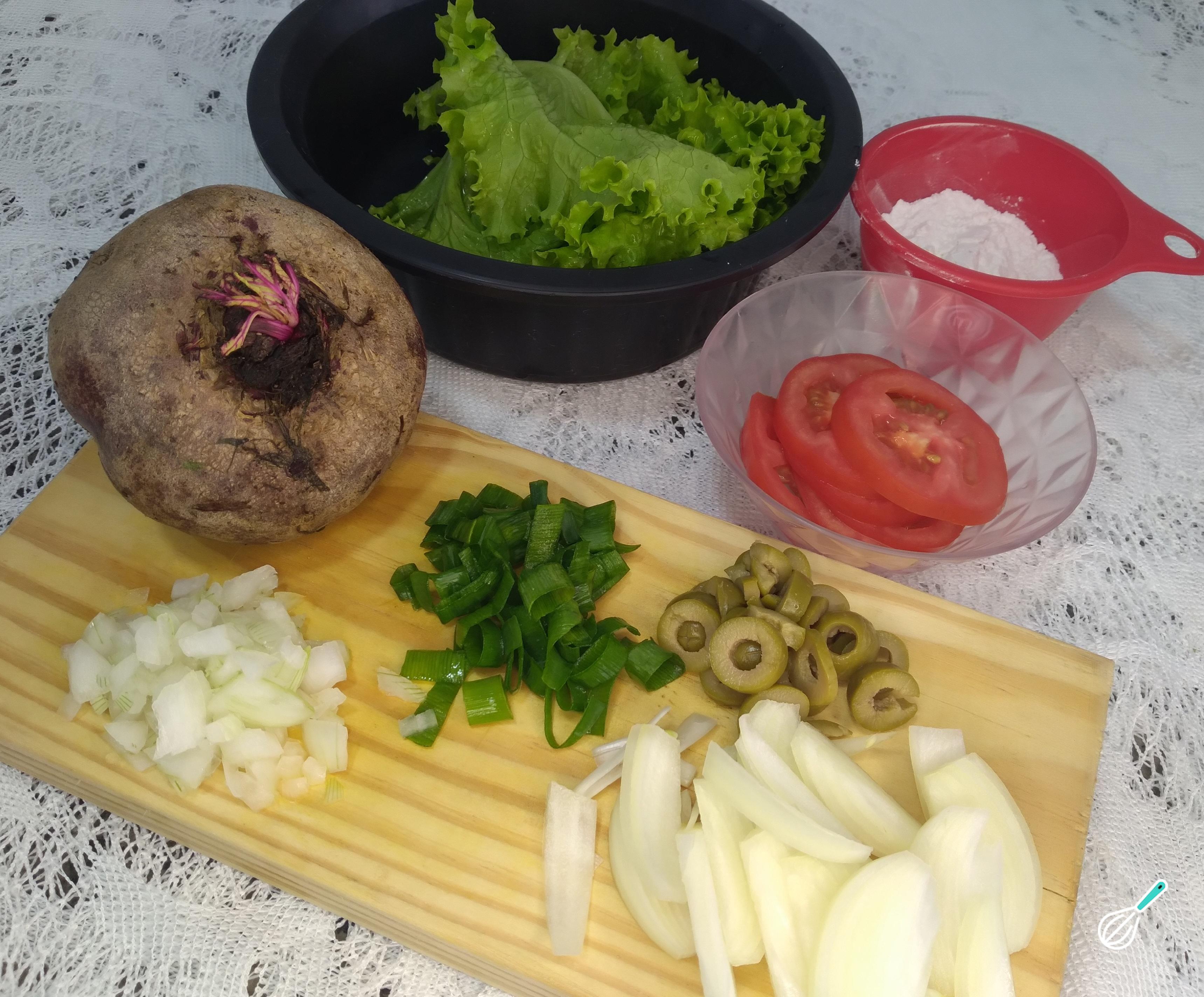 Comece separando os ingredientes para o preparo do hambúrguer de beterraba. Separe uma beterraba grande, corte uma cebola em cubos pequenos e a outra cebola no formato de meia lua. A cebolinha verde, corte em pedaços finos. Corte as azeitonas em rodelas pequenas e meça a farinha de arroz.