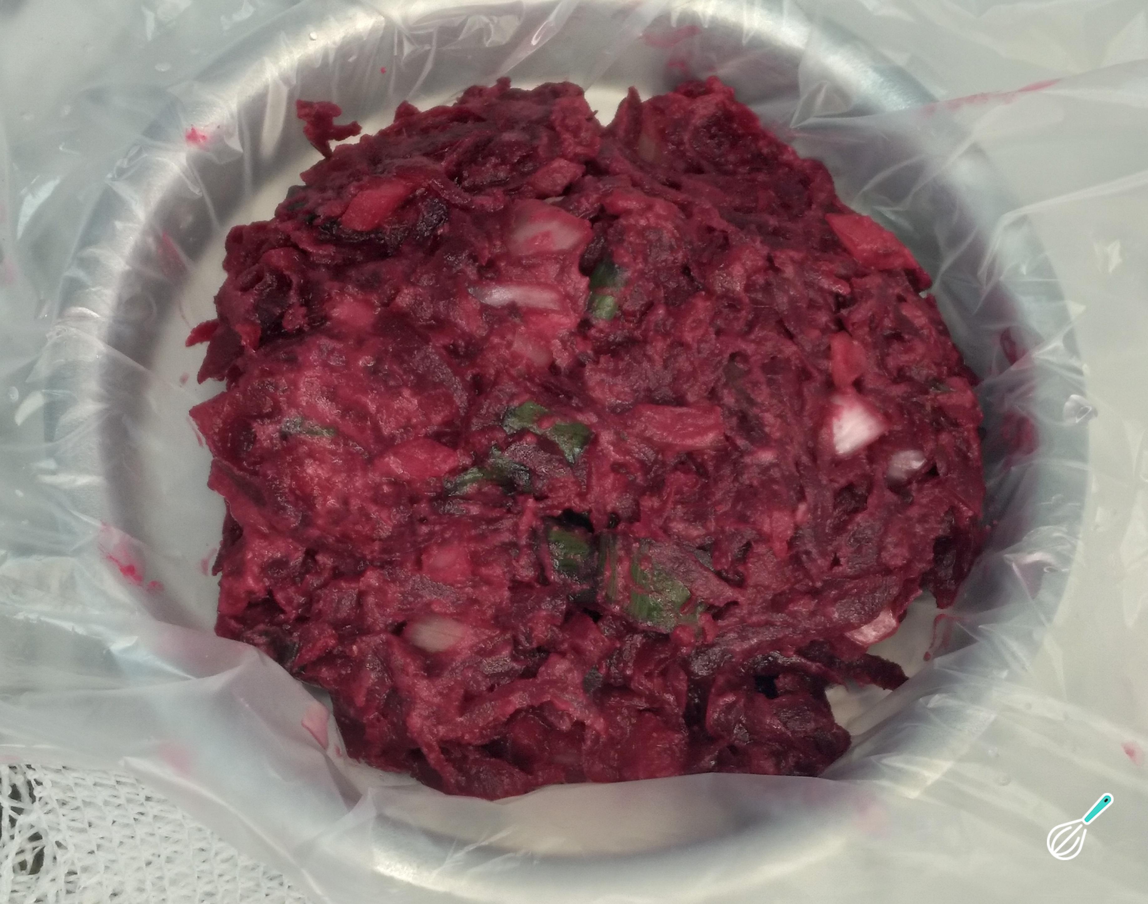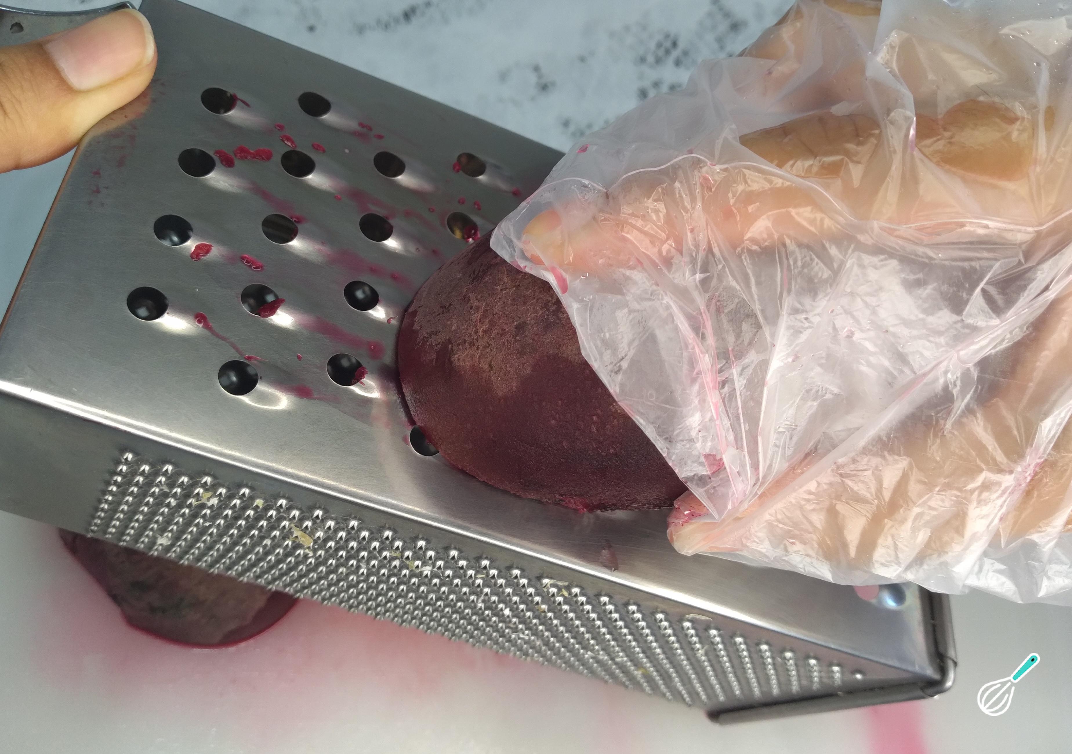 Depois de cozida, com o auxílio de um ralador, rale a beterraba no lado mais grosso. Aconselho o uso de um saco culinário ou luvas culinárias nas mãos, já que a beterraba solta um liquido que mancha.