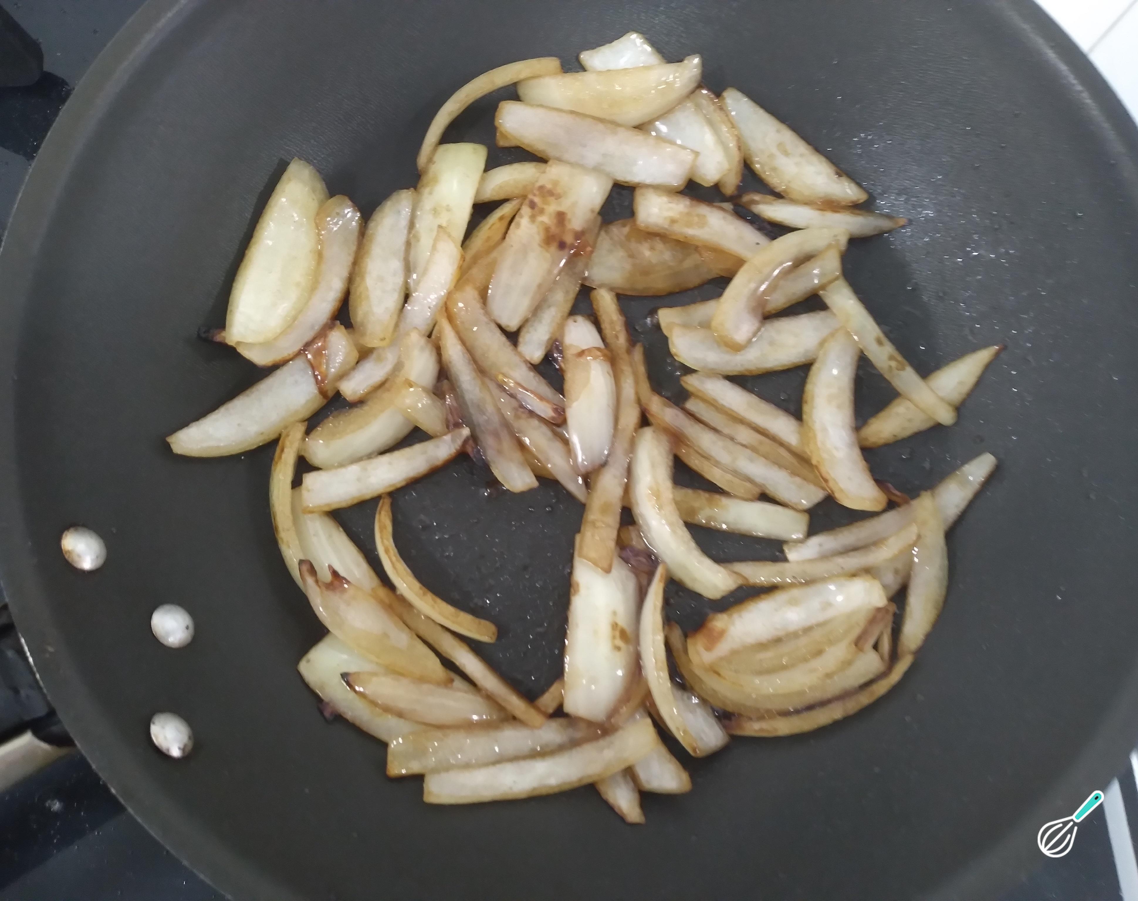 Enquanto os bifes descansam no congelador, faça as cebolas tostadas. Em uma frigideira, coloque um fio de azeite e tostes as cebolas em formato de lua. Deixe dourar e desligue. Reserve.