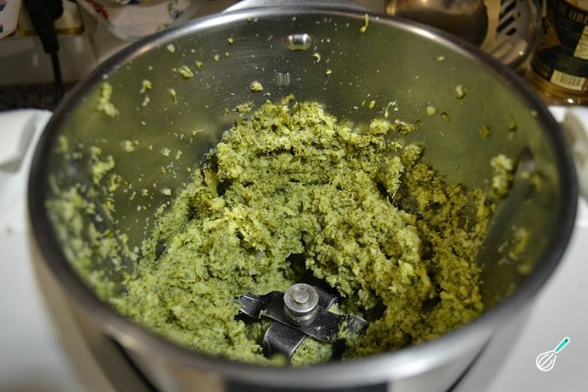 Coloque o brócolis num processador e bata. Acrescente o alho e a cebola e volte a bater, para ficar bem. Junte os restantes ingredientes e bata até obter uma massa fácil de modelar.