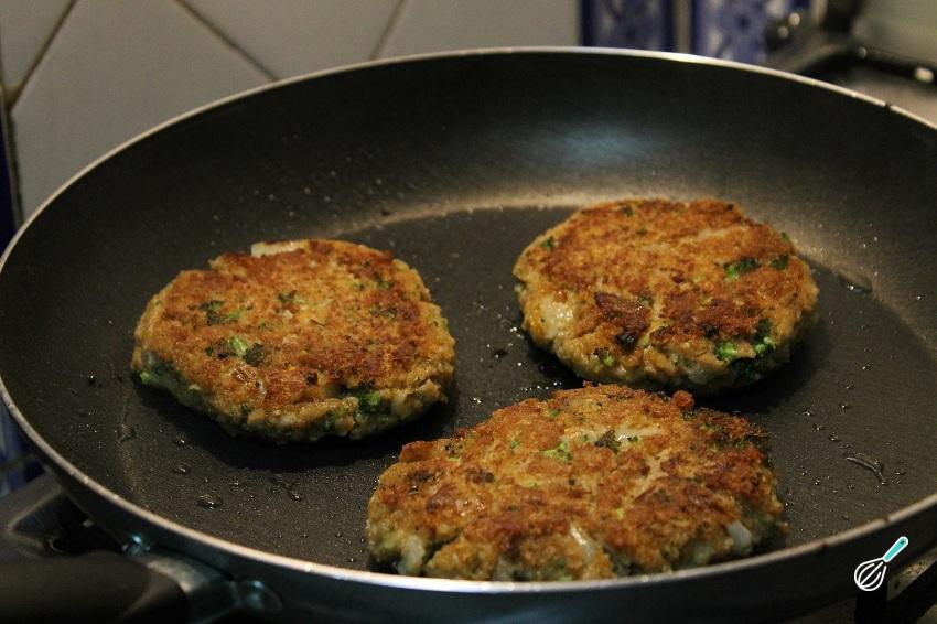 Leve ao fogo uma frigideira com um pouco de azeite e, quando estiver quente, coloque um pouco da massa de brócolis modelada em forma de hambúrgueres. Deixe dourar por 3-4 minutos de cada lado e retire.