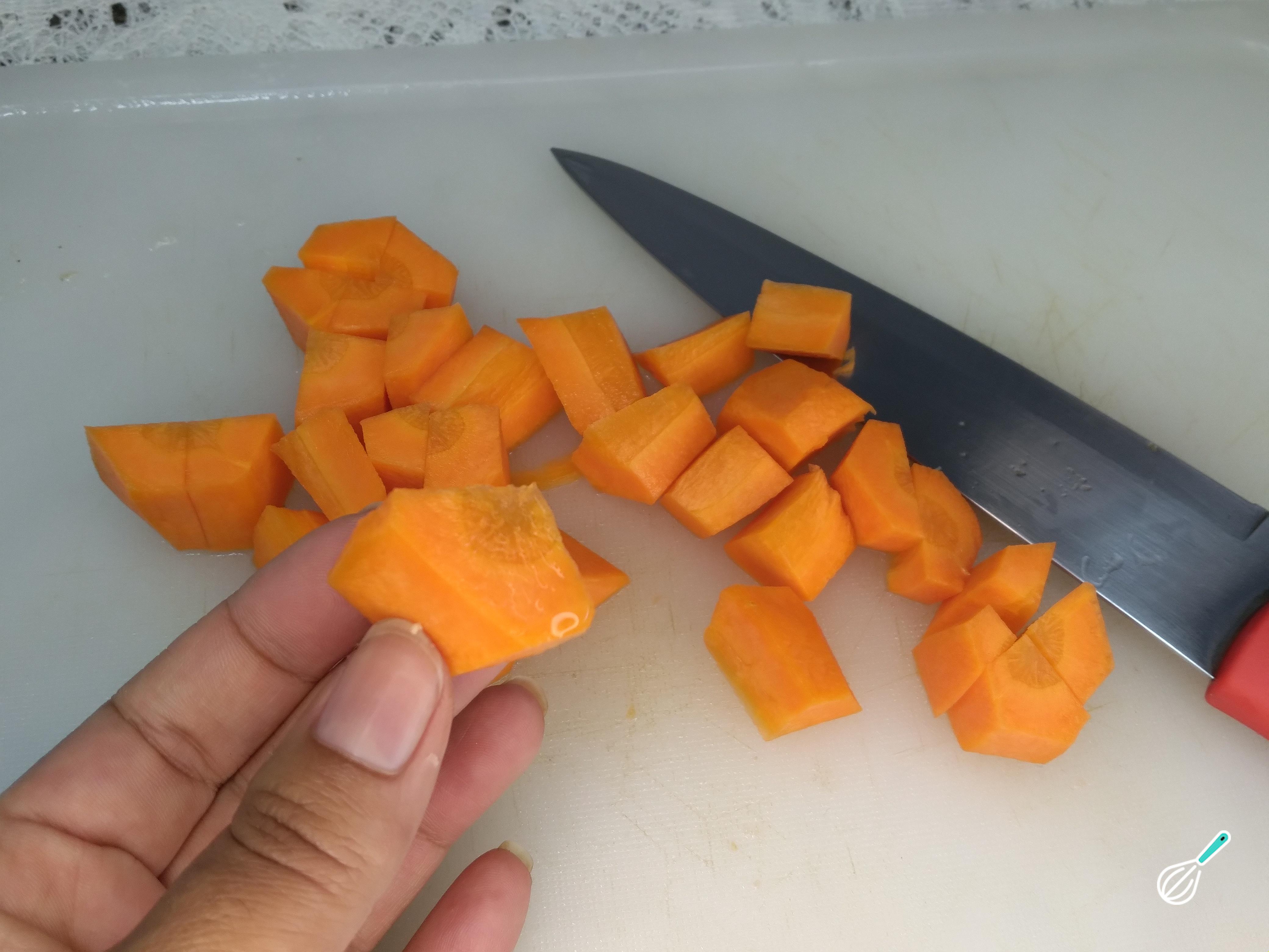 Feito isso, limpe bem a cenoura e retire a casca. Corte a cenoura em cubos médios. Corte ao meio e depois em 4 pedaços.