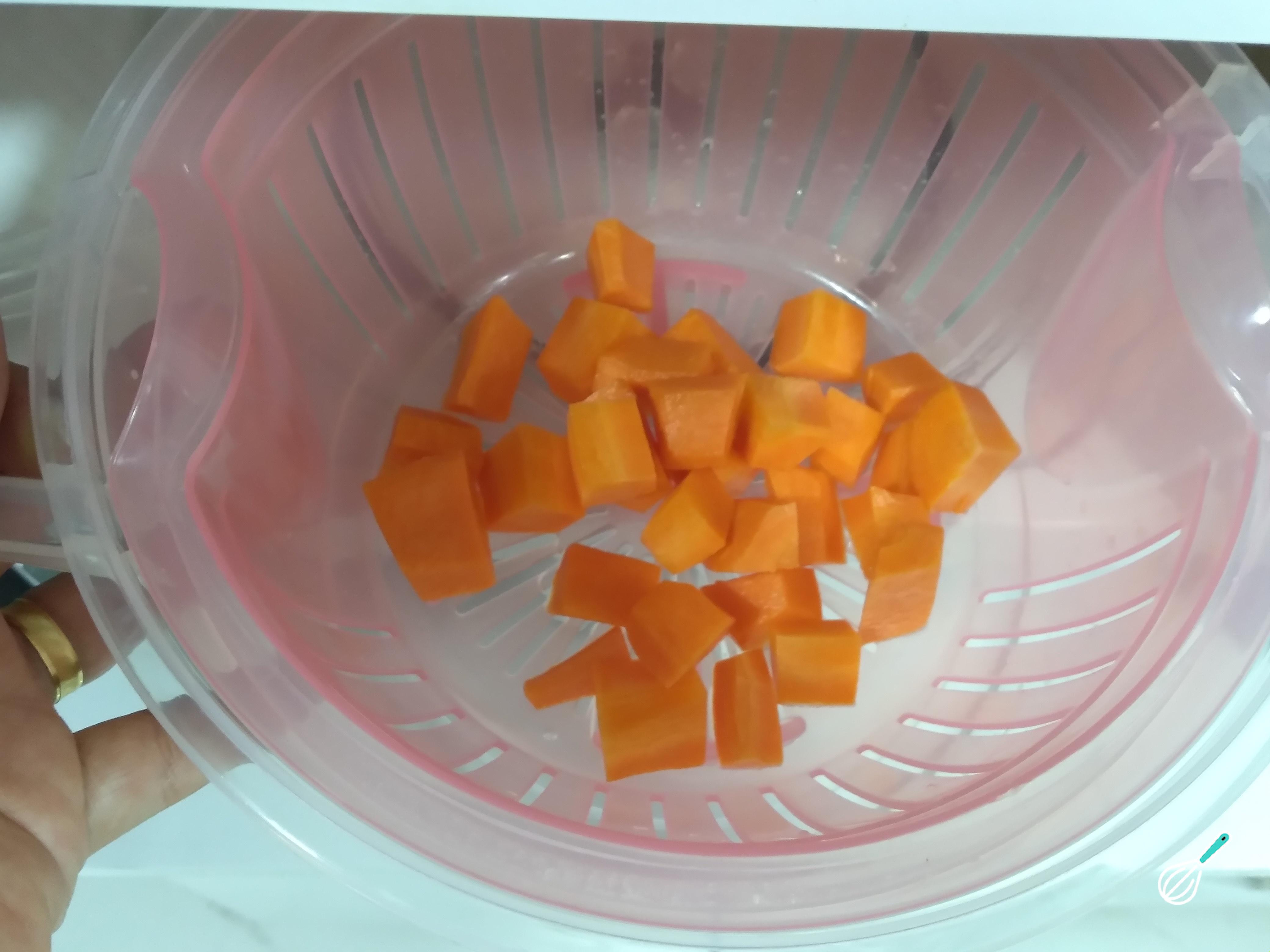 Em seguida, usando uma panela para microondas, coloque a cenoura picada e um dedo de água. Leve ao microondas por 6 minutos parando no meio, aos 3 minutos para mexer a panela. Se não tiver microondas ou preferir fazer na panela, cozinhe a cenoura do jeito tradicional em água fervente.