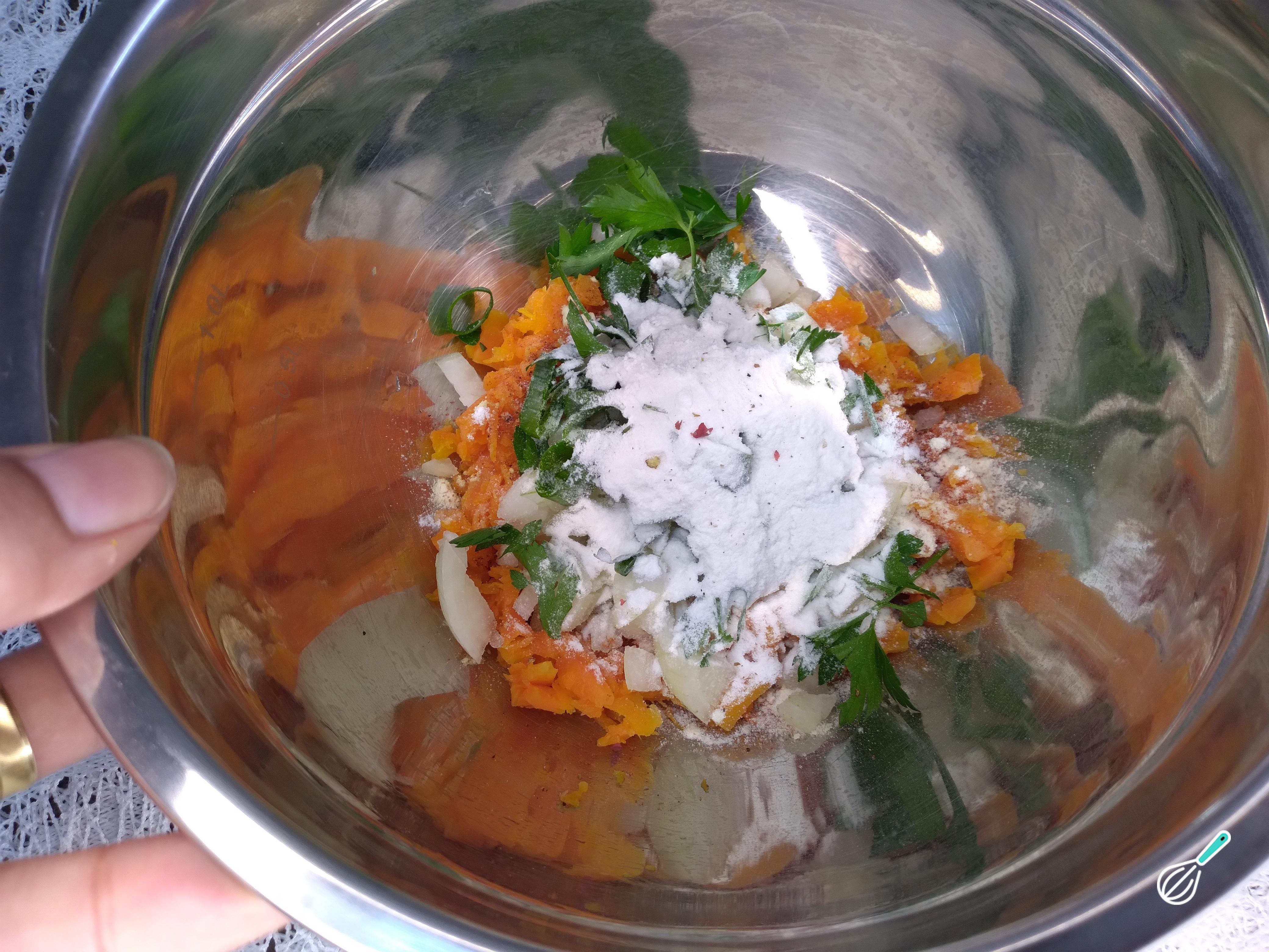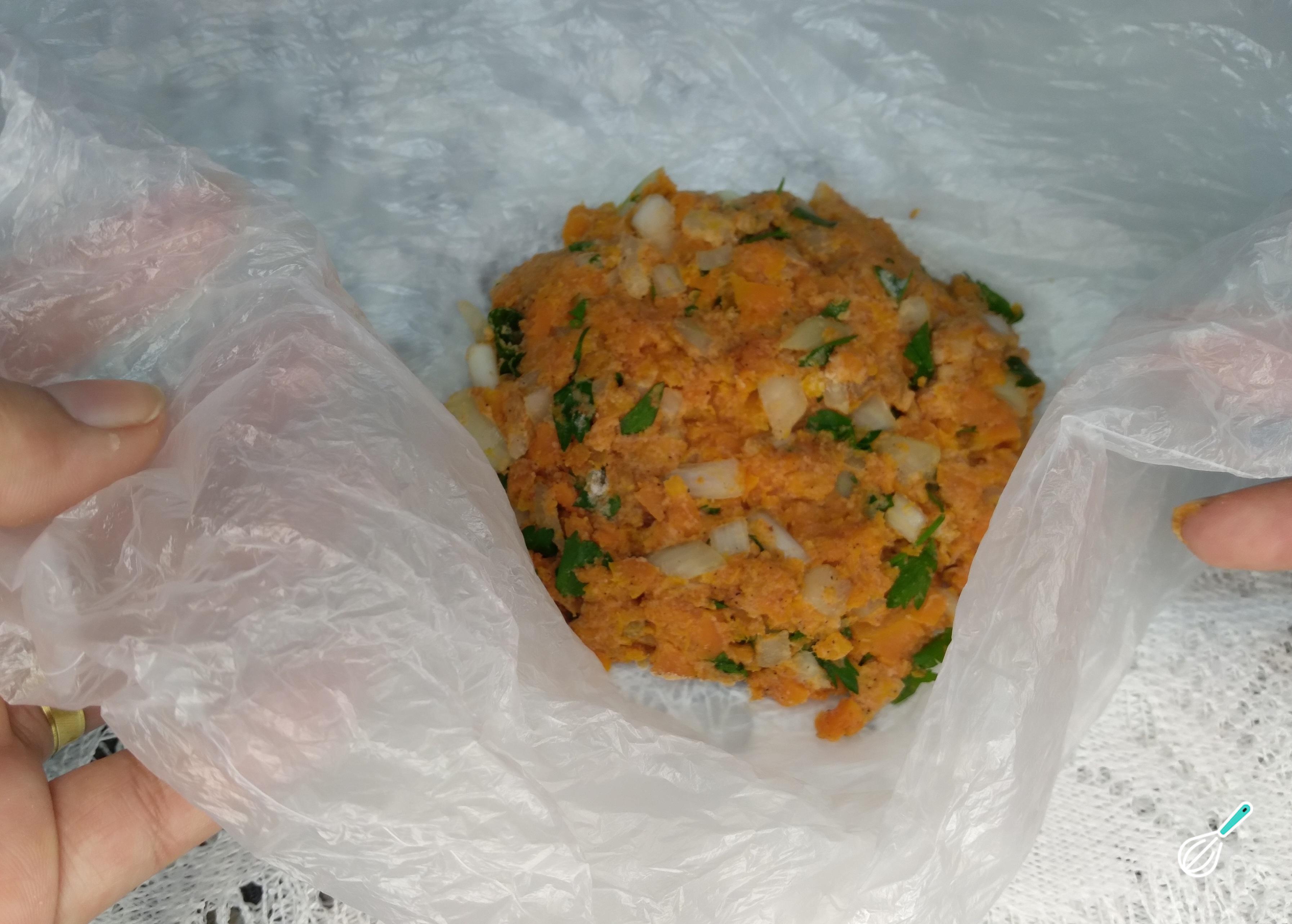 Depois de cozida a cenoura, coloque em um prato e com o auxílio de um garfo amasse bem. Feito isso, transfira para um bowl. Coloque a cebolinha verde, a cebola branca cortada em cubos, a farinha de arroz, os temperos de sua preferência e o sal. Misture tudo muito bem e modele o hambúrguer.