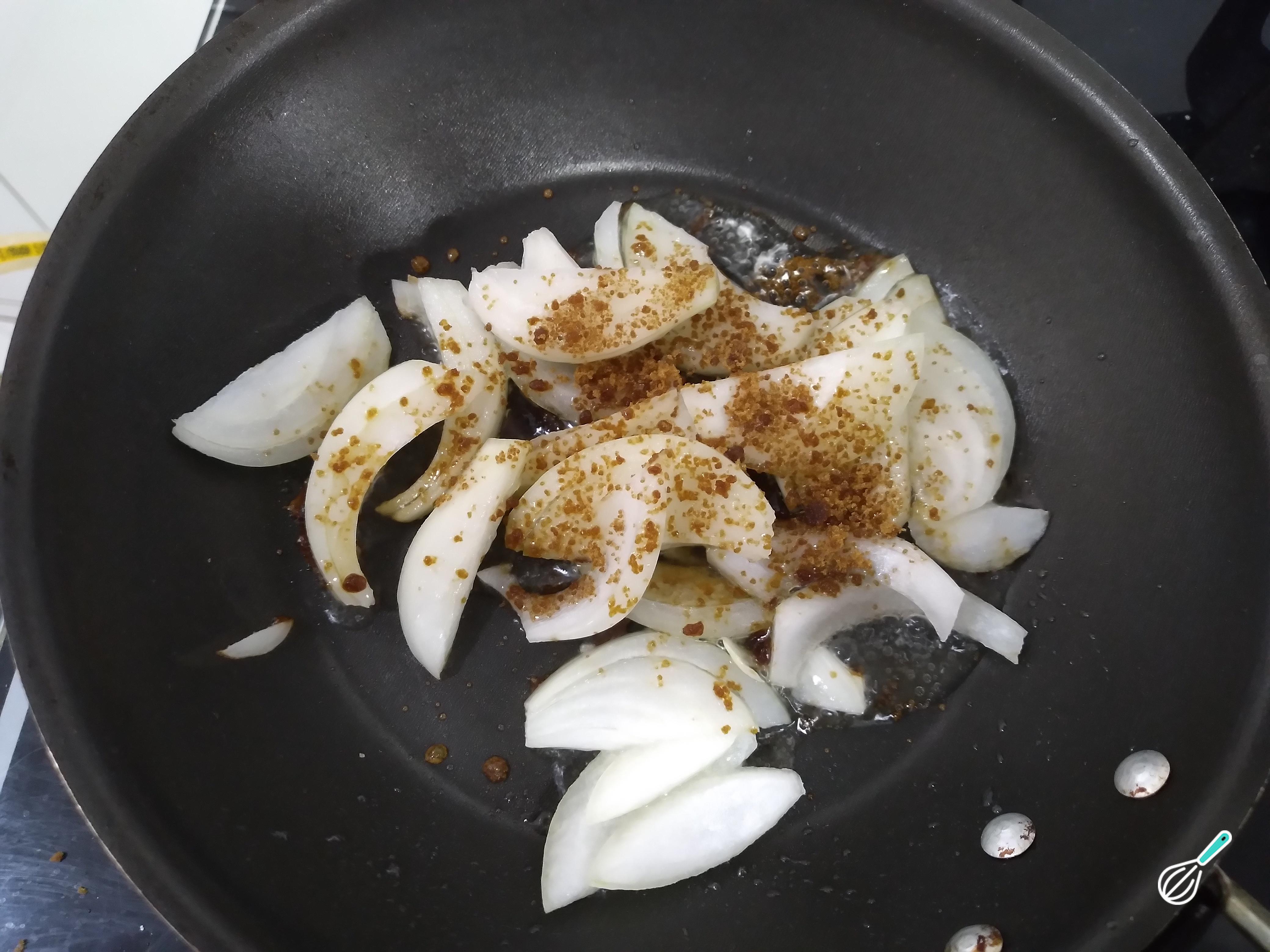 Enquanto o hambúrguer está no congelador, vamos fazer a cebola. Em uma frigideira coloque 2 colheres de óleo de soja e acrescente as cebolas cortadas em meia lua e o açúcar mascavo. Em fogo baixo deixe caramelizar. Depois retire e reserve.
