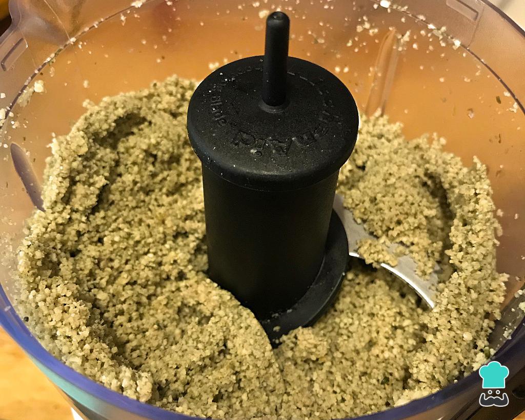 Comece seu super hambúrguer vegano colocando o mix de sementes num processador (ou liquidificador) e batendo tudo por 3 minutos, até as sementes virarem quase uma pastinha.