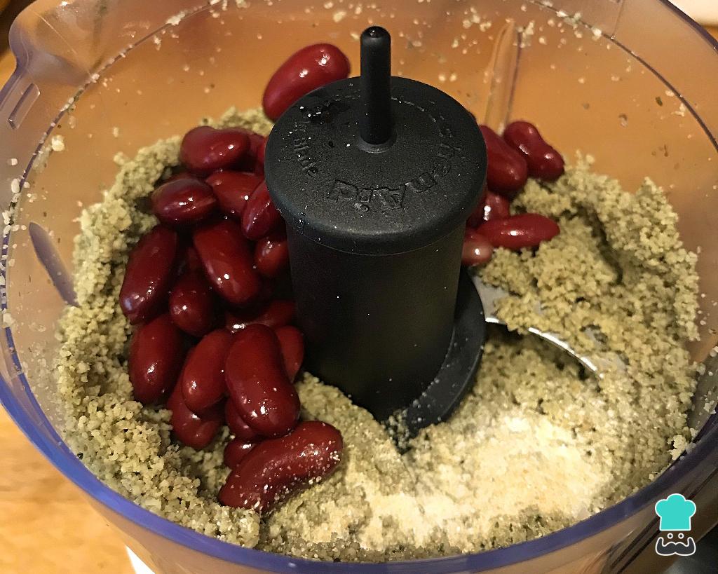 Em seguida adicione o feijão vermelho já cozido e os temperos. Bata bem, até virar uma massa.