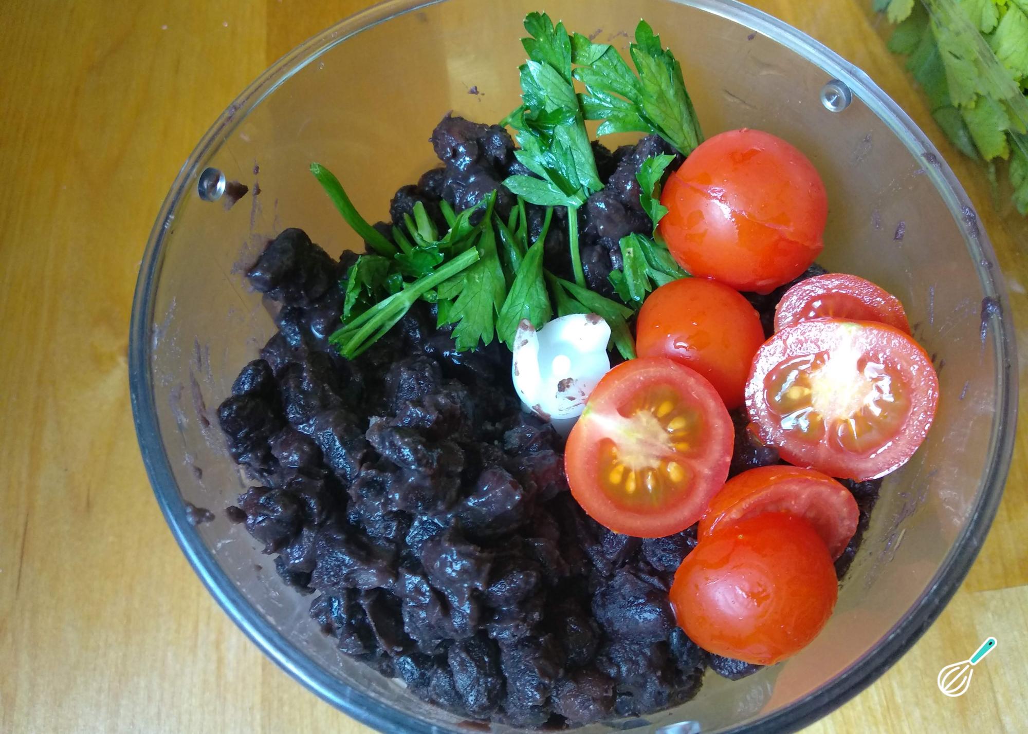 Coloque o feijão no liquidificador junto com a salsinha e os tomates. Bata muito bem até virar uma pasta.