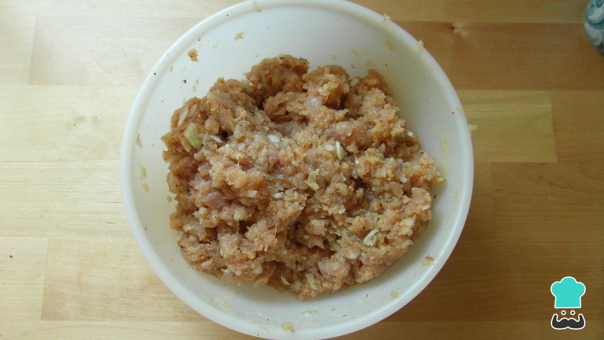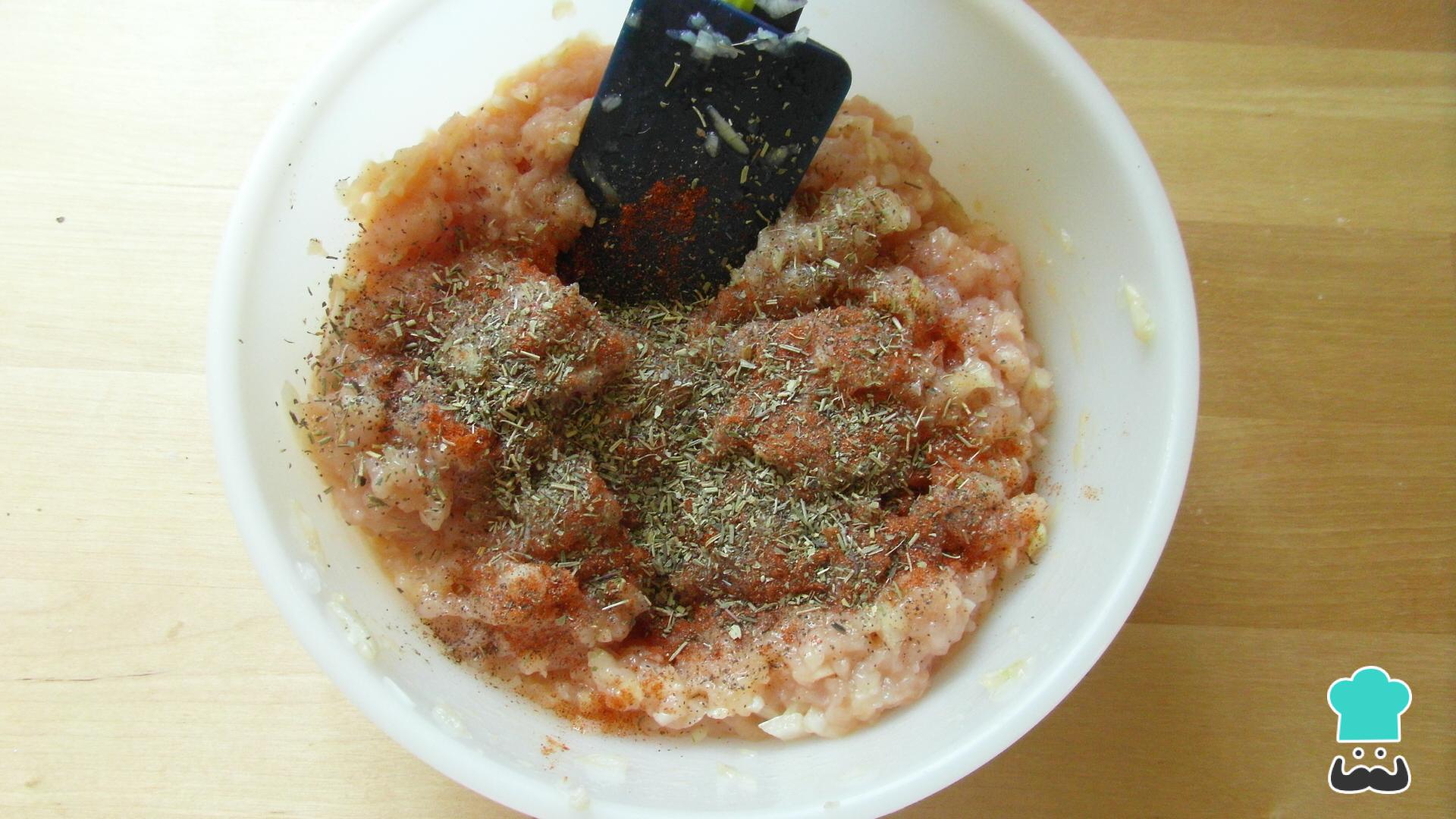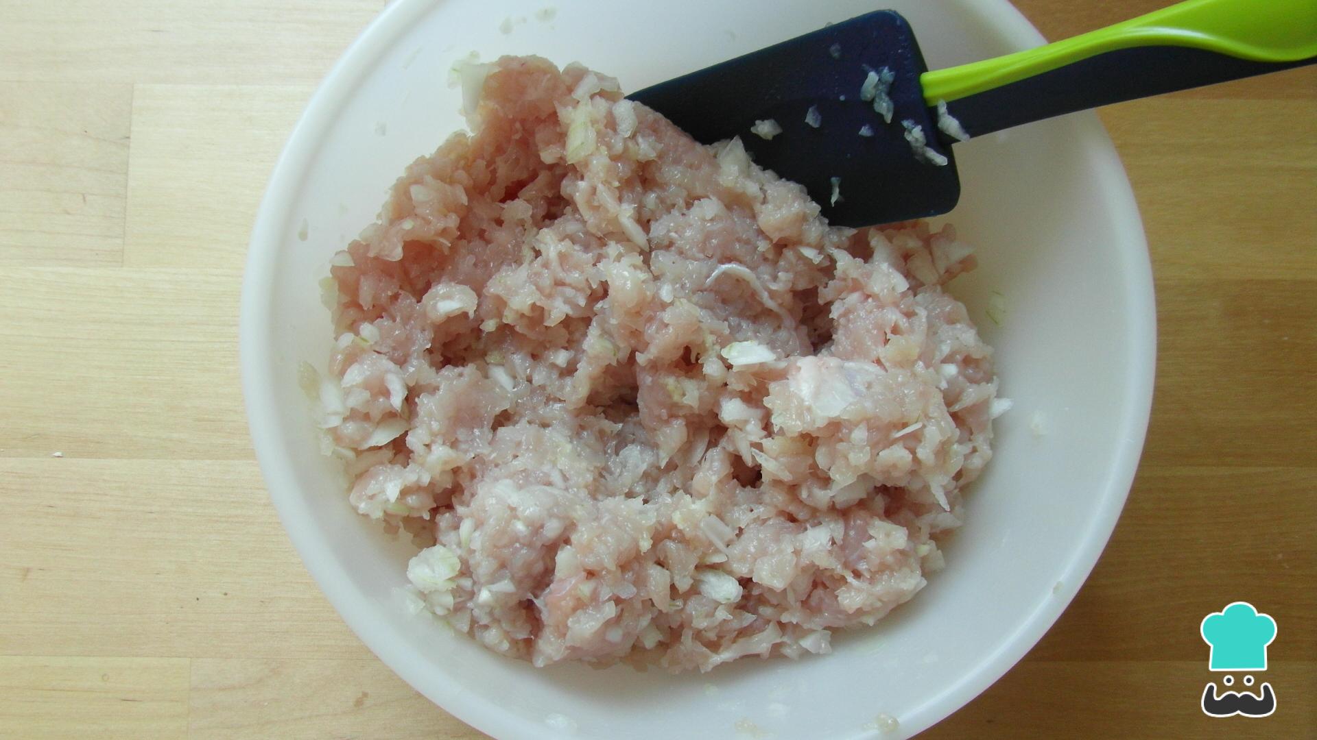 Acrescente os dois ingredientes anteriores à carne moída e misture muito bem. Esta é a base do hambúrguer de frango caseiro.