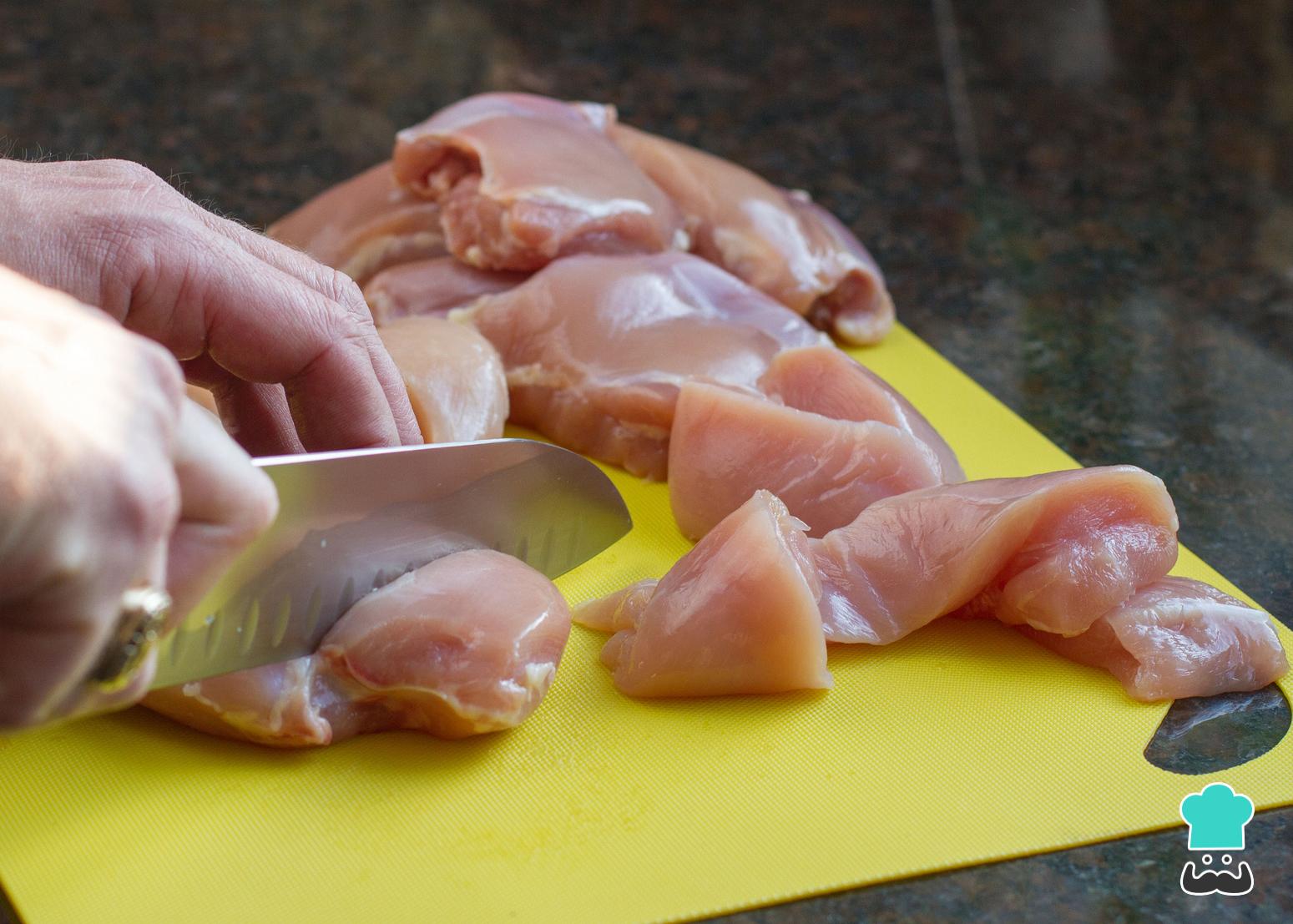 Fazer hambúrguer de frango caseiro é bem fácil! Para isso comece limpando os peitos de frango de gorduras, ossos e nervuras. Corte em pedaços médios, para facilitar o passo seguinte.