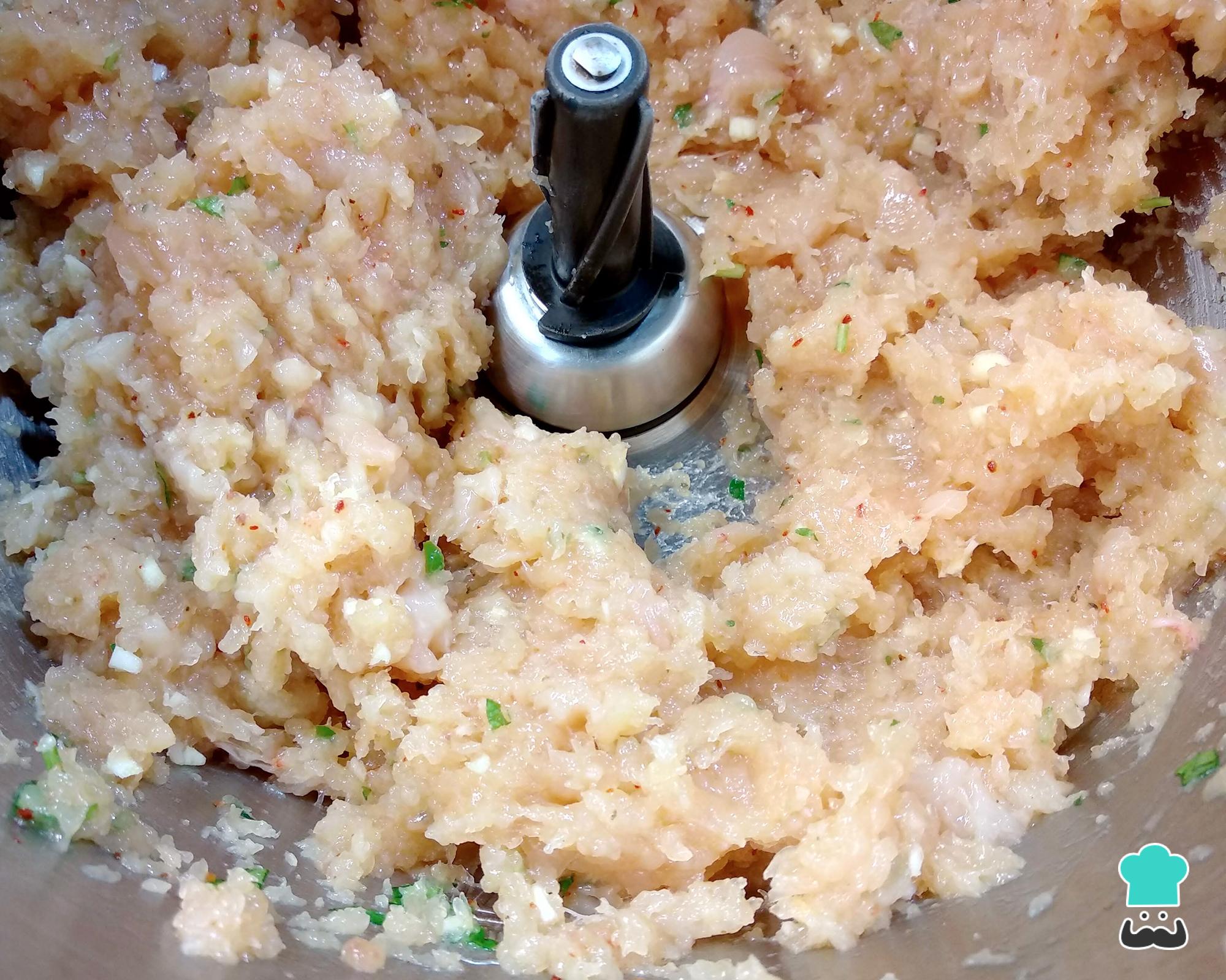 Quando seu frango estiver bem processado, do jeito mostrado na fotografia, retire porções e modele em forma de hambúrguer. Para modelar mais facilmente os seus hambúrgueres de frango, unte suas mãos com um pouco de uma gordura saudável (azeite de oliva, óleo de coco, entre outras).