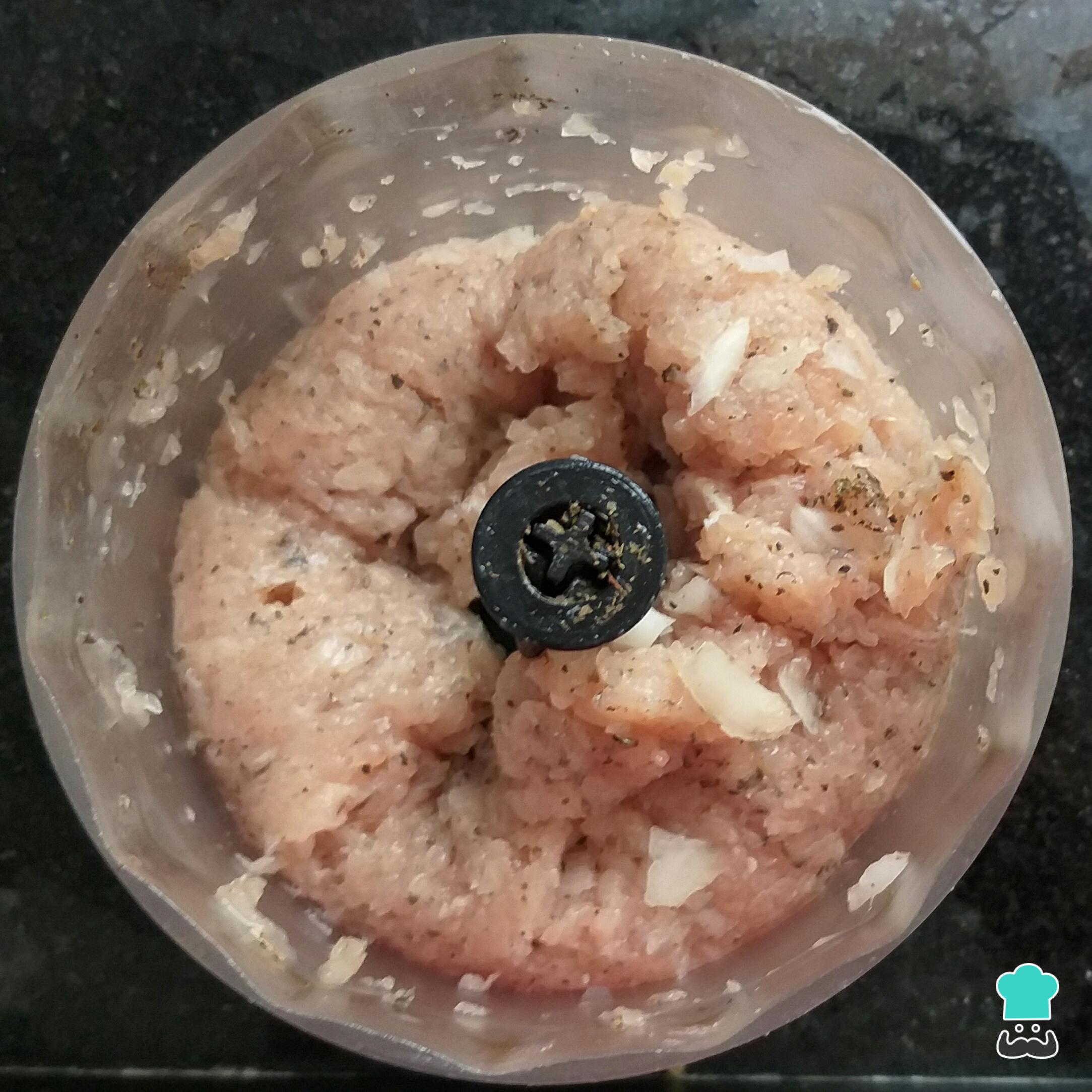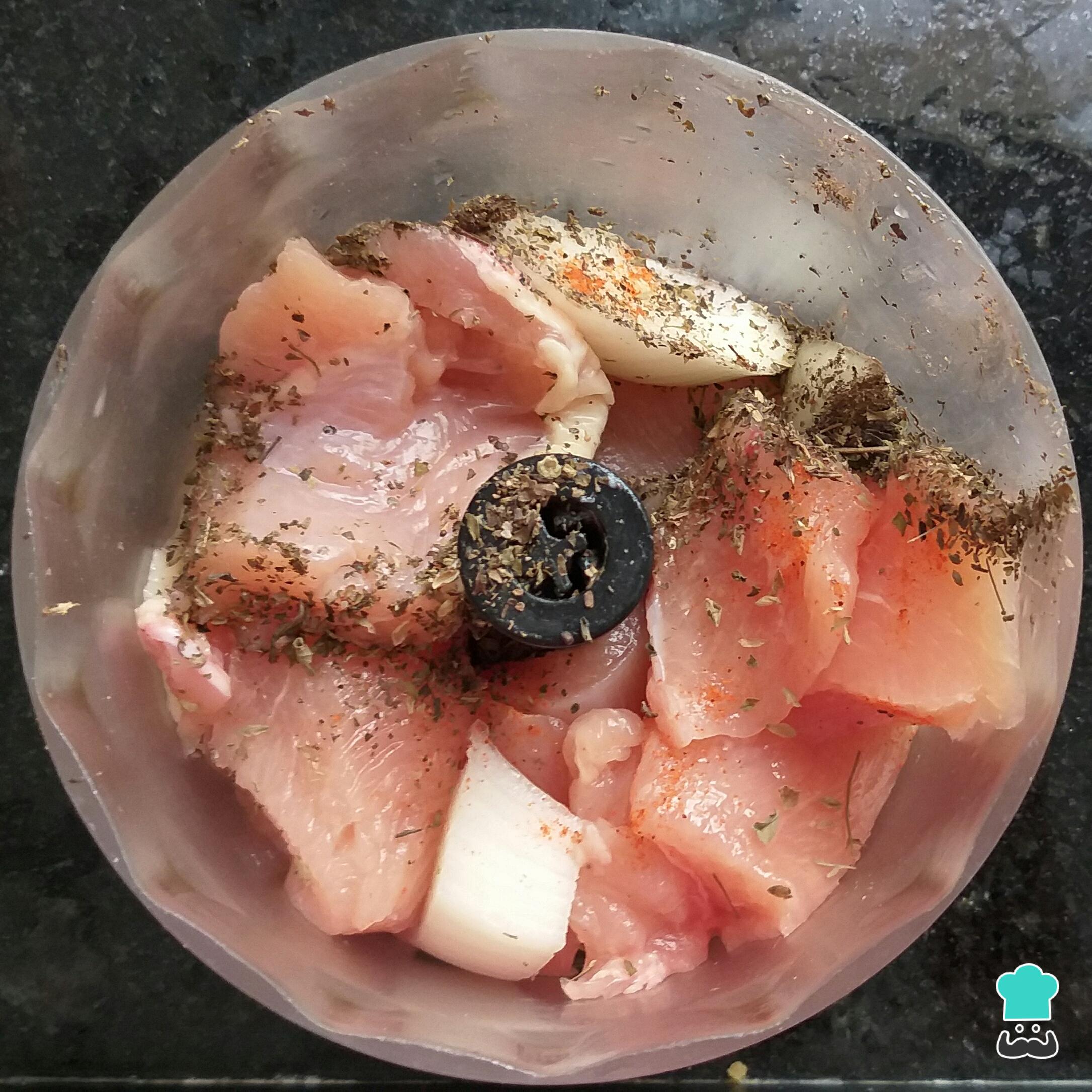 Dica: Outra opção é comprar o frango já moído, nesse caso basta bater com os ingredientes somente até misturar.