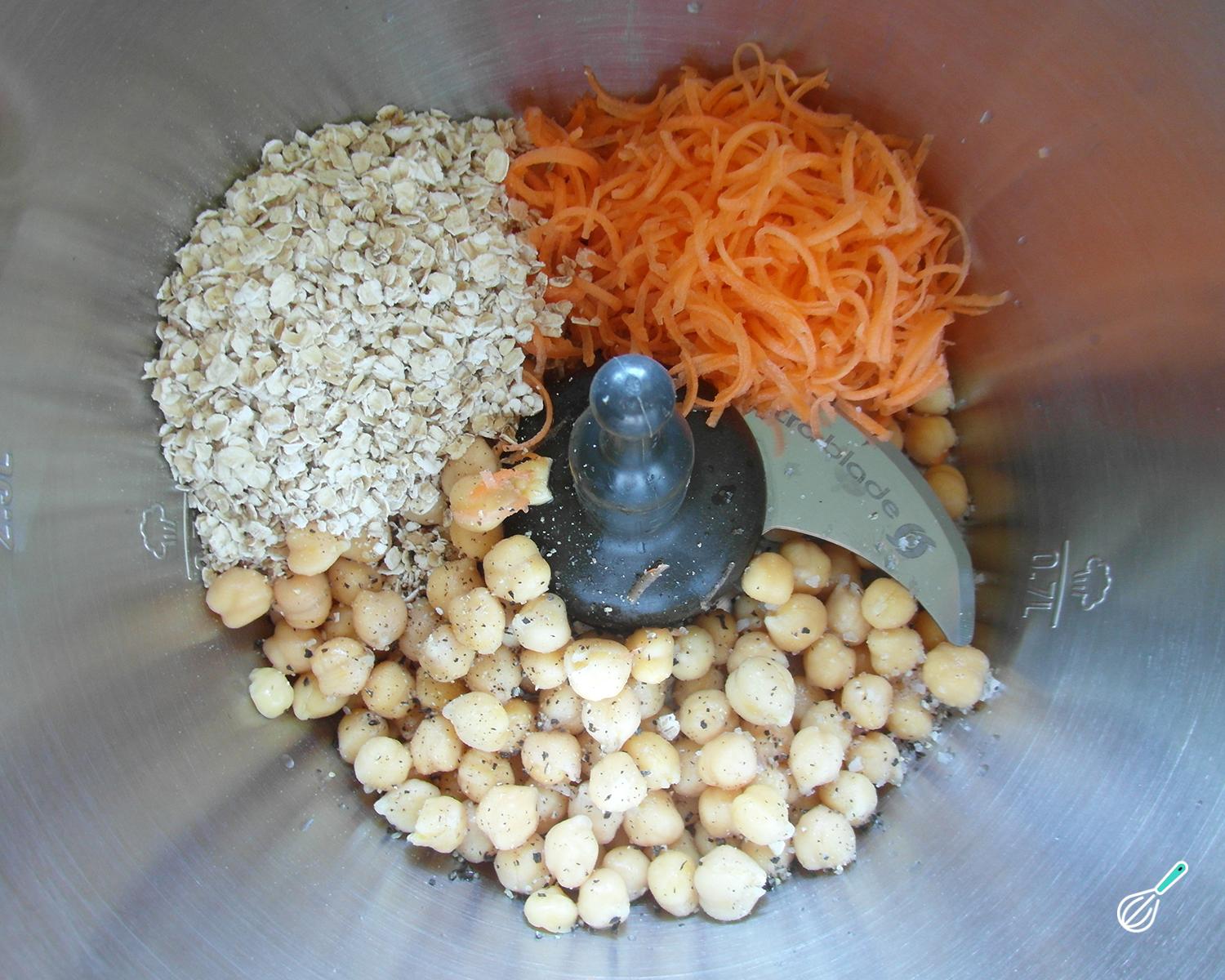 Para preparar esta receita de hambúrgueres de grão de bico coloque o grão, a cenoura, o alho e a aveia num robot de cozinha ou processador de alimentos. Acrescente sal e pimenta a gosto e bata por alguns minutos.