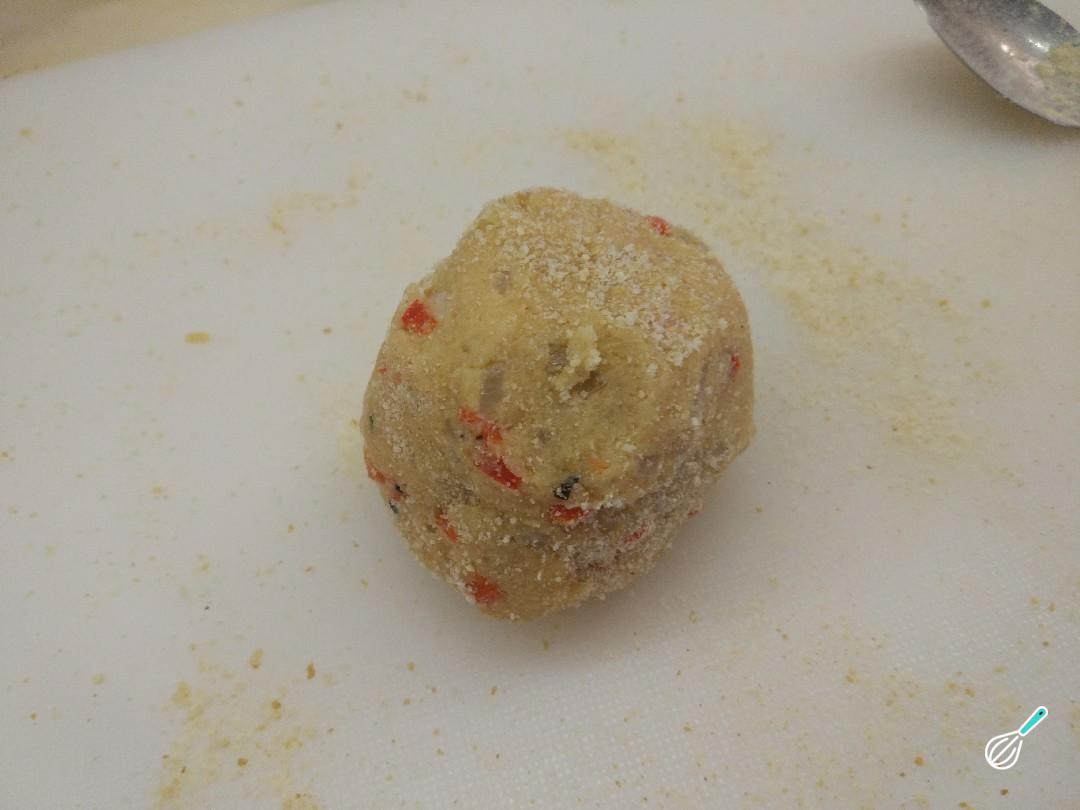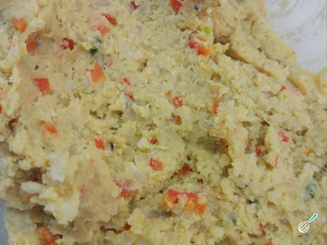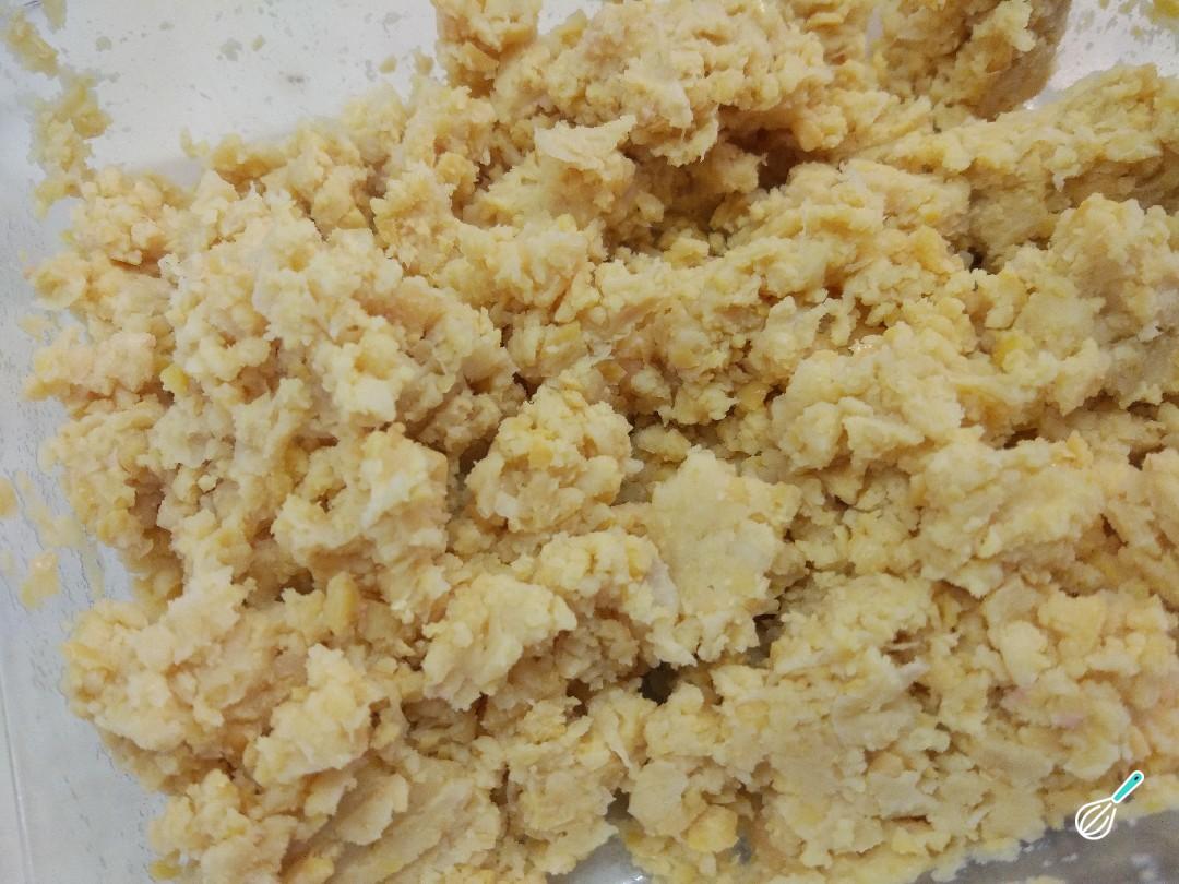 Logo, misture o refogado com o grão de bico e adicione os cominhos e o pão ralado. Envolva tudo e em seguida adicione a margarina derretida e a farinha de mandioca. Volte a envolver tudo até obter uma massa consistente e ligeiramente grudenta. Polvilhe o queijo ralado e envolva de novo.