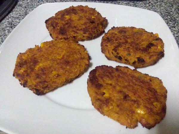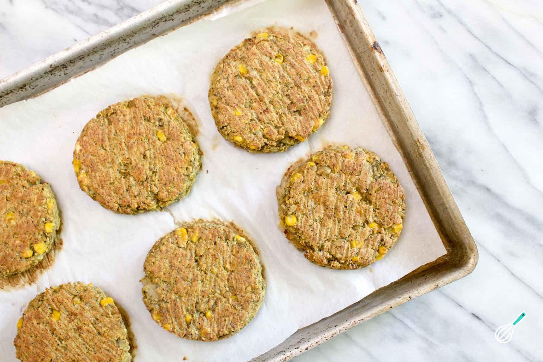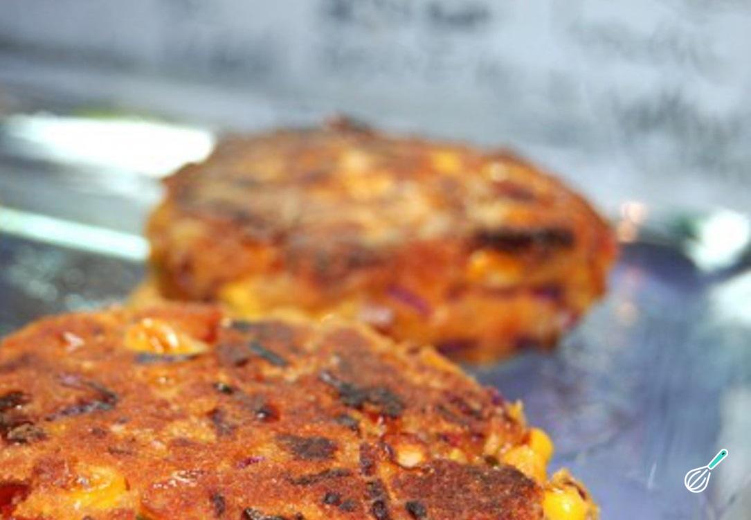Retire e está prontinho! Recomendo que você sirva o seu hambúrguer de milho com um delicioso cuscuz marroquino com legumes e amêndoas.