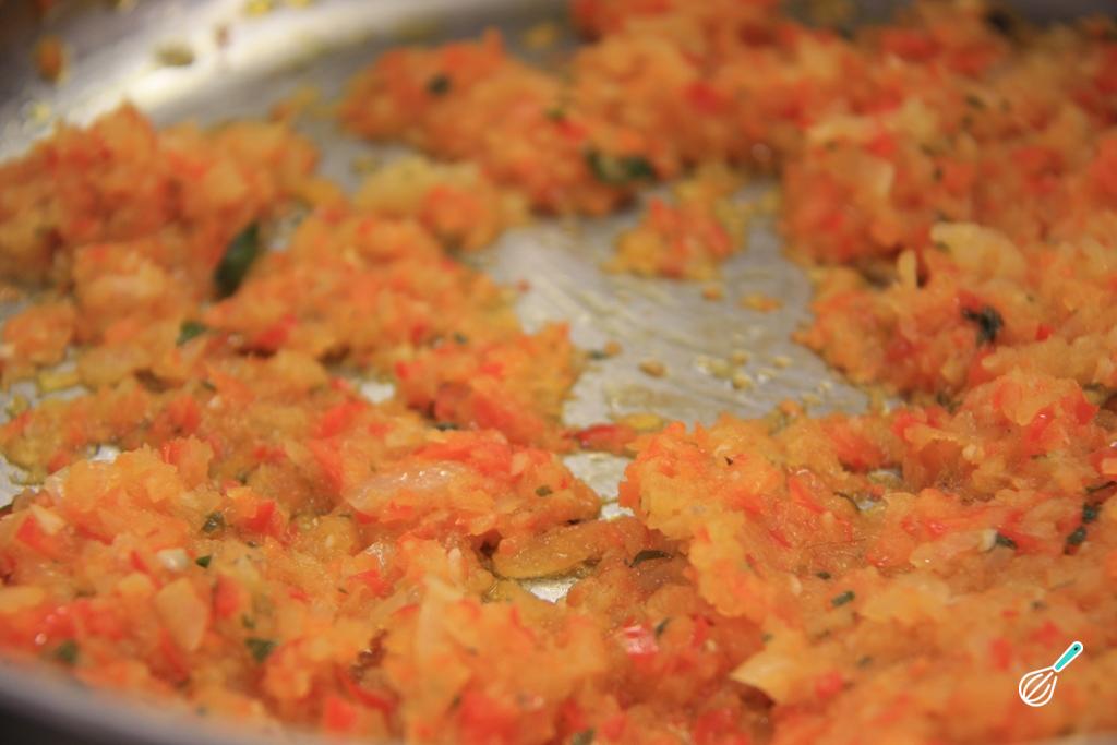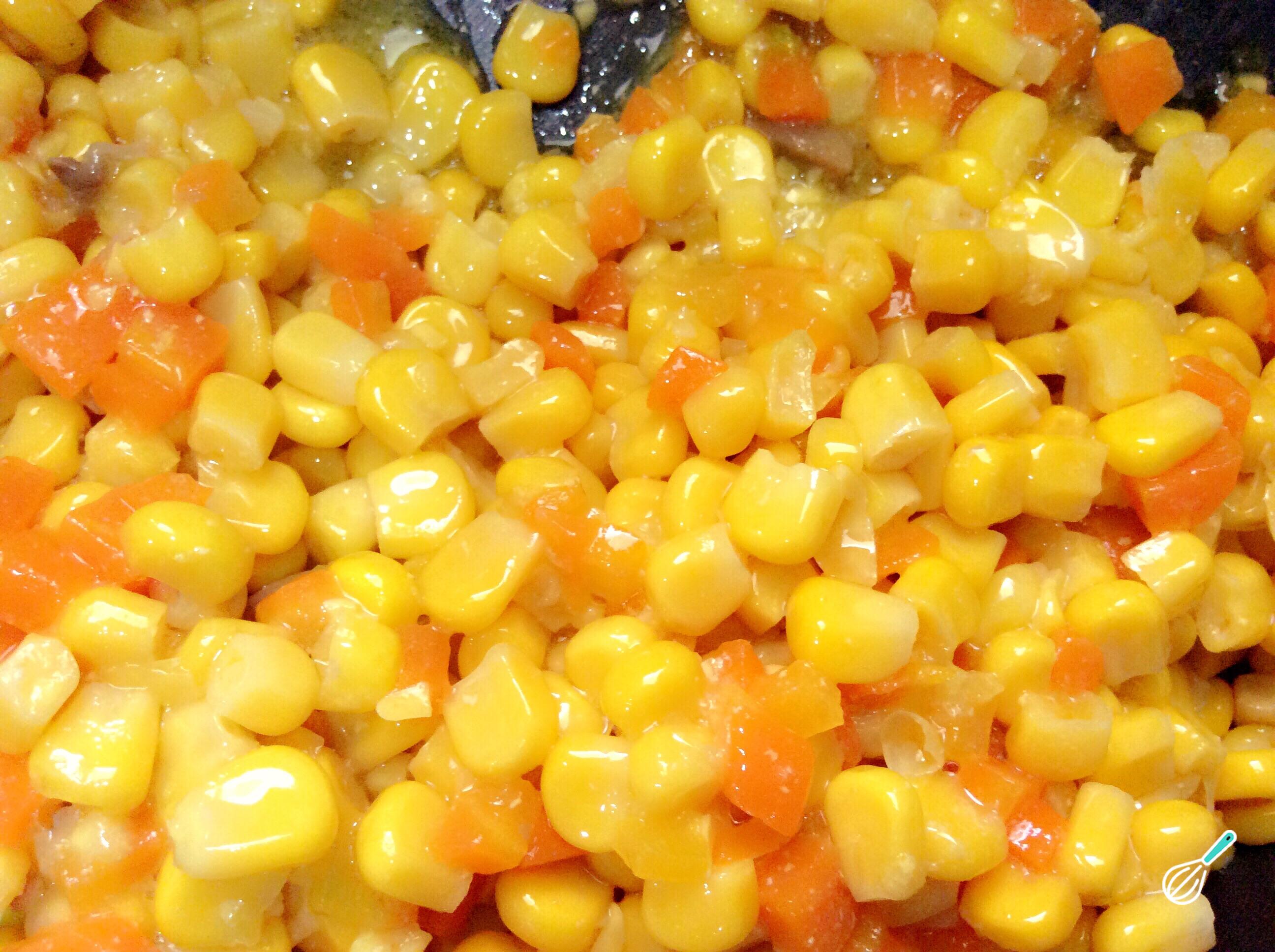 Para fazer hambúrguer de milho comece por dourar o alho, o tomate e a cenoura em uma panela com um pouco de óleo. Tempere com suas ervas e especiarias favoritas e deixe refogar por alguns minutos.