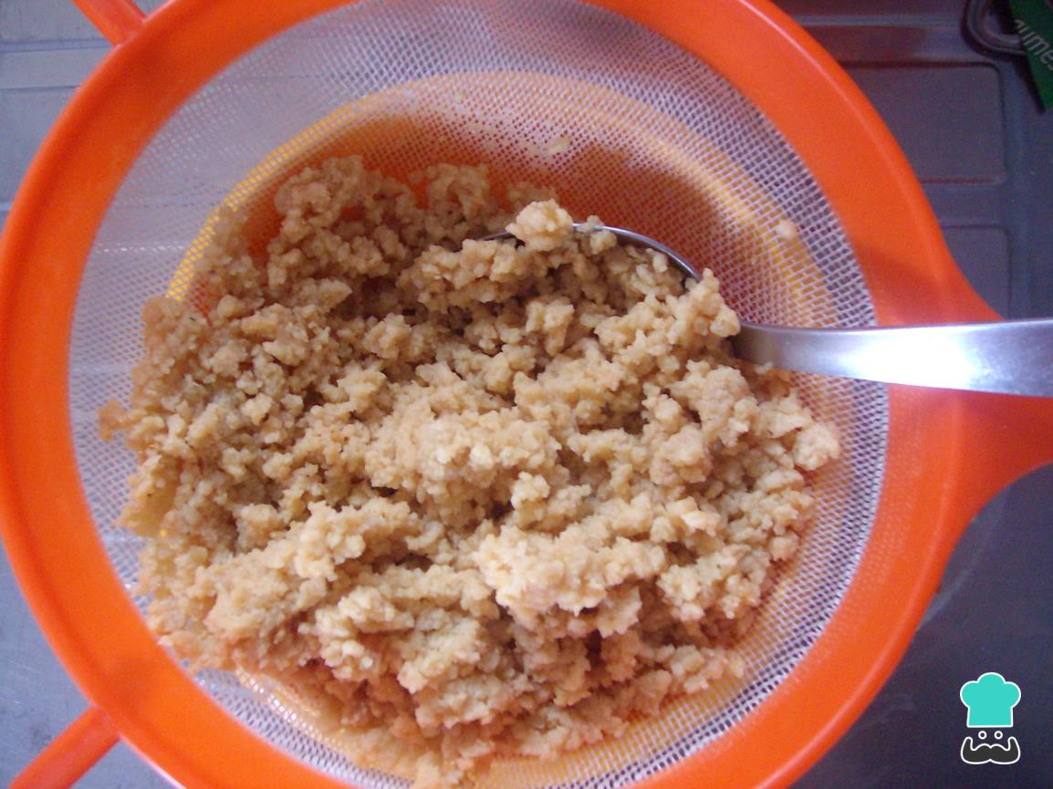 Quando estiver macia, semelhante a uma esponja, esprema bem com as mãos ou escorra em uma peneira, pressionado com uma colher, para retirar toda a água. Reserve.